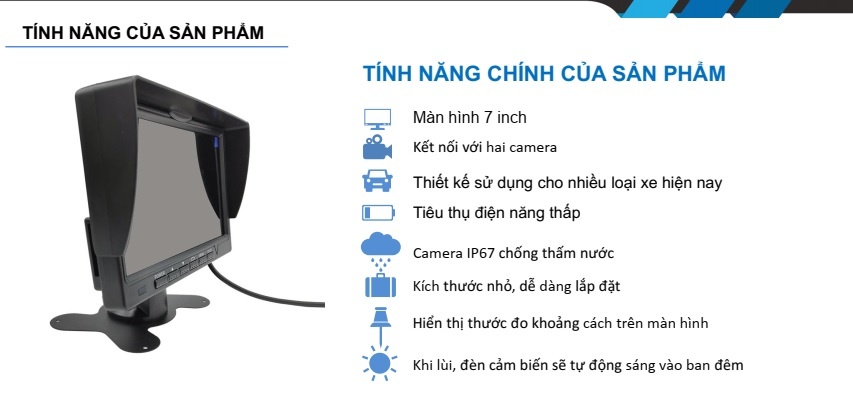 VM-RCT01 là bộ camera lùi chuyên dụng cho xe ô tô, xe tải. Màn hình TFT LCD 7 inch kết nối camera lùi phái sau, hỗ trợ người lái xe an toàn với camera lùi, hình ảnh sắc nét truyền về màn hình.