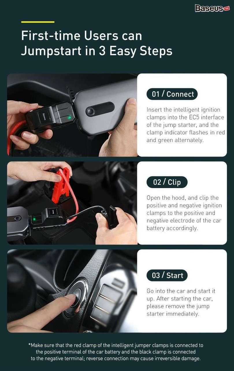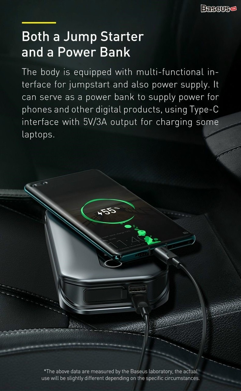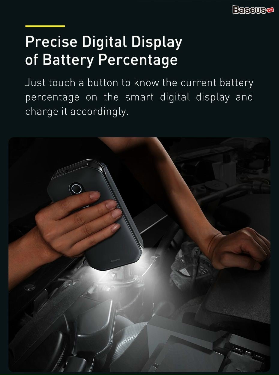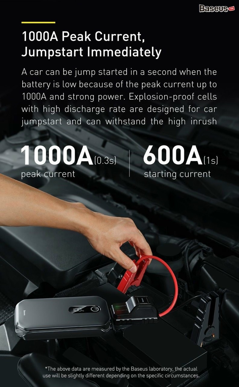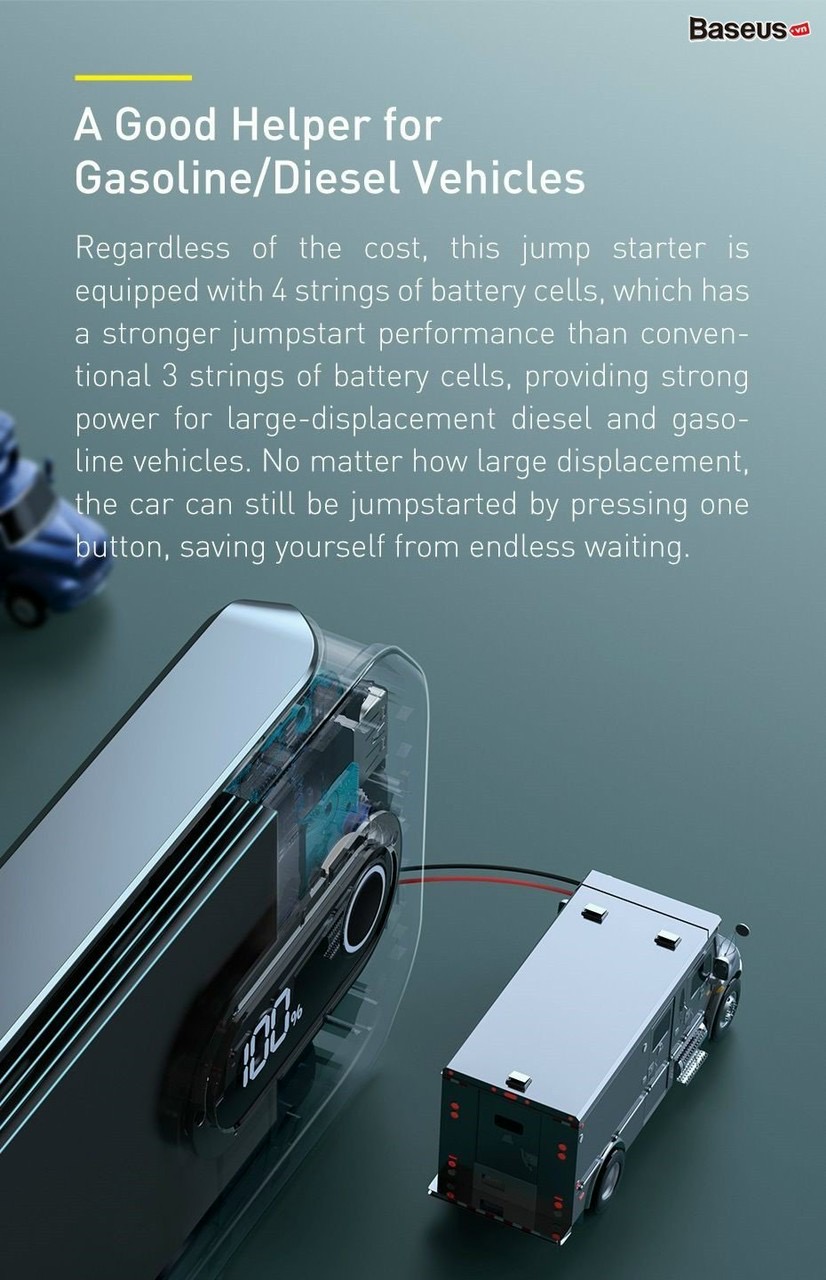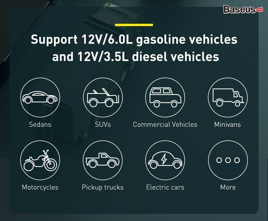- Được thiết kế chuyên dụng, Bộ Kích bình Baseus Super Energy Pro Car Jump Starter phù hợp cho các loại xe ô tô sử dụng xăng và dầu hiện nay với dòng điện kích khởi động cao nhất có thể đạt tới 1000A và công suất mạnh mẽ.