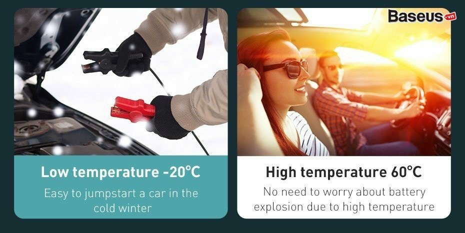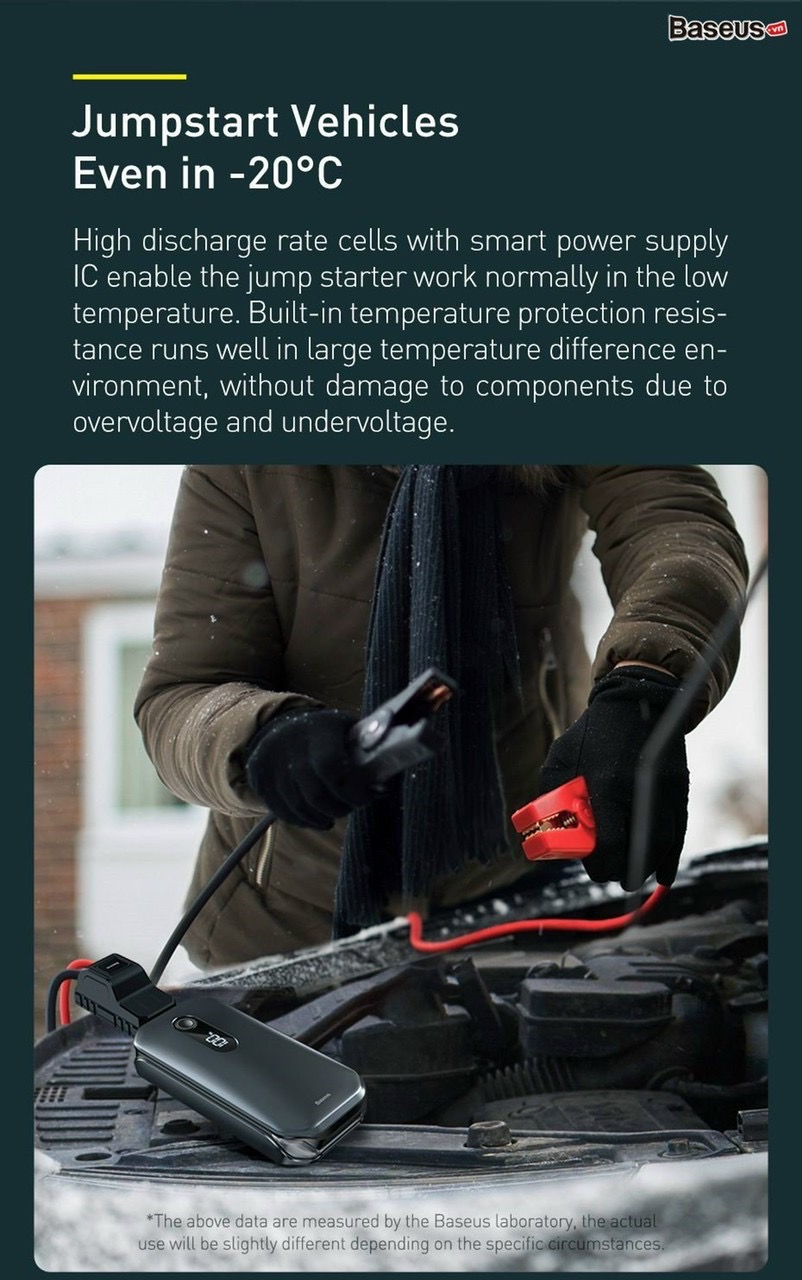 - Bộ kích bình dùng cho xe hơi Baseus Super Energy Pro Car Jump Starter có độ bền và tính an toàn cao, được làm từ chất liệu chống cháy nổ. Phần khung vỏ làm bằng hợp kim chắc chắn và sang trọng, độ hoàn thiện cao. Chip xử lý thông minh có khả năng giữ cho thiết bị hoạt động ổn định trong tình trạng khí hậu khắc nghiệt (-20°C -> 60°C).