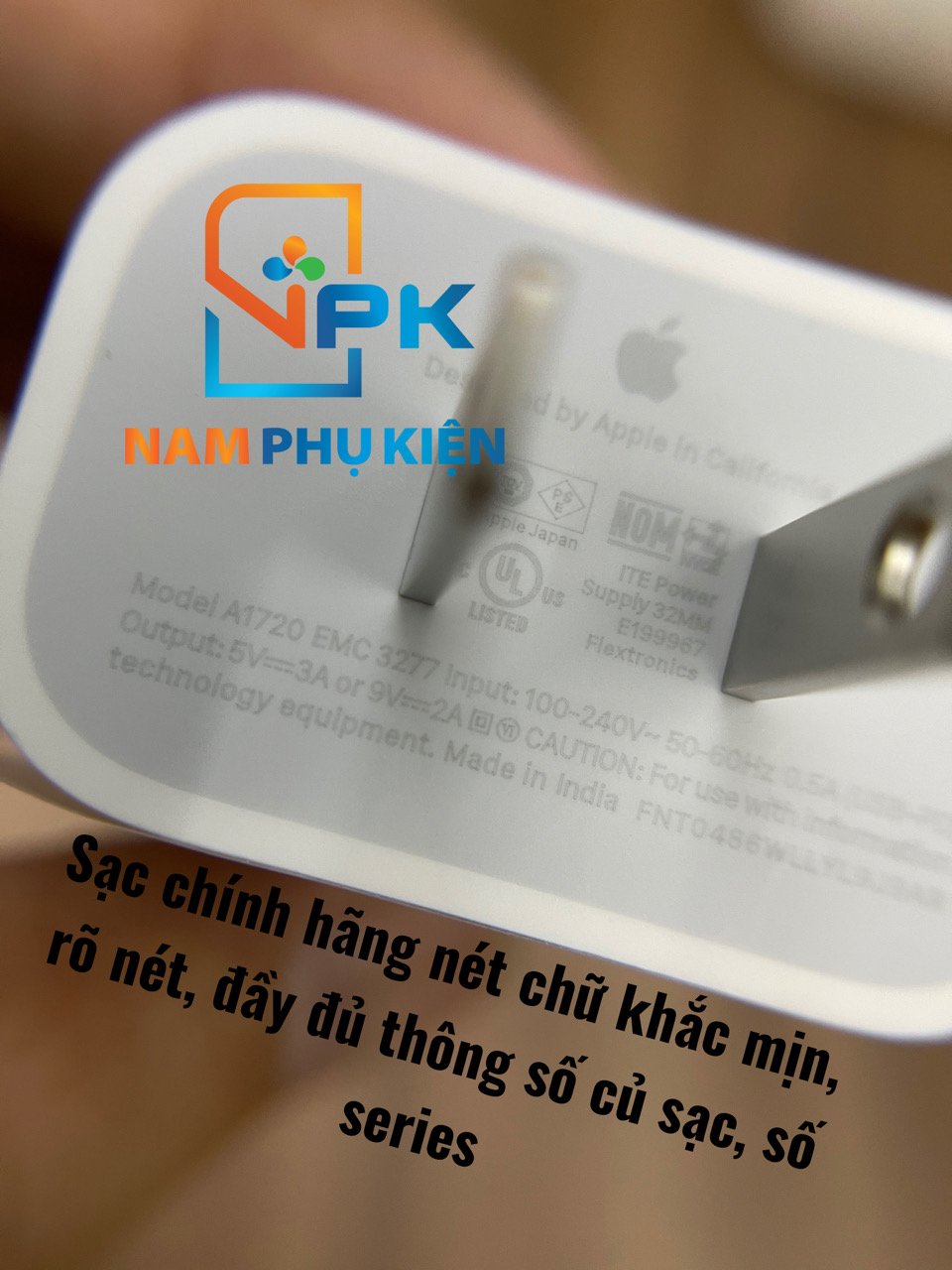- Trên củ sạc có số seri, các chỉ số kỹ thuật được in rõ nét, chấu sạc rất cứng dù có dùng 2 ngón tay bóp mạnh cũng không bị cong như hàng fake.