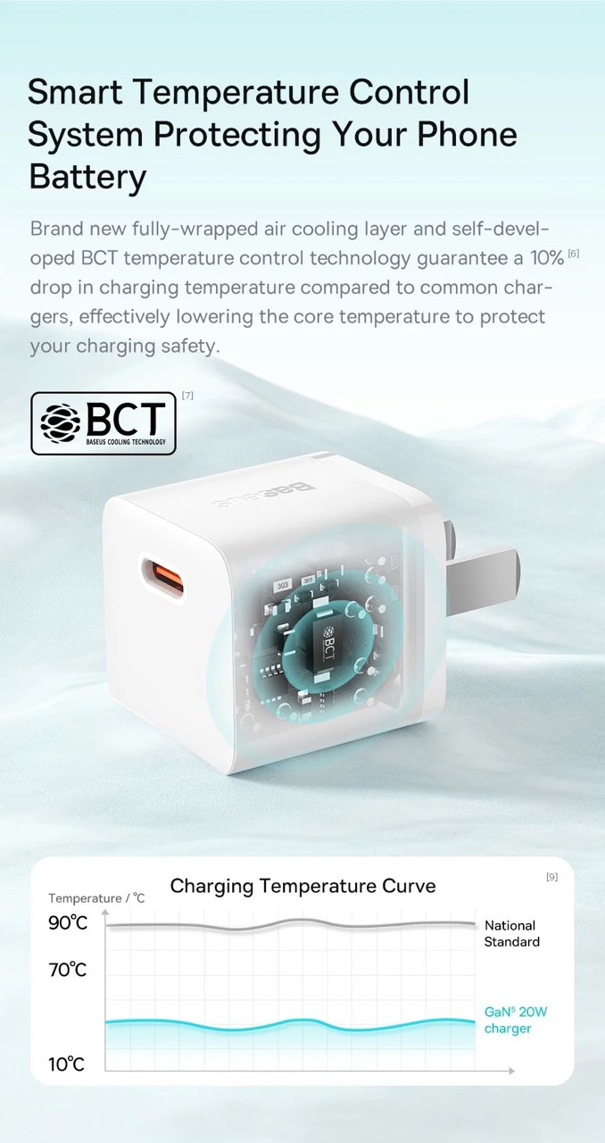 Lớp làm mát không khí hoàn toàn mới được bao bọc hoàn toàn và công nghệ kiểm soát nhiệt độ BCT tự phát triển đảm bảo nhiệt độ sạc giảm 10% so với các loại sạc thông thường. Hạ nhiệt độ lõi một cách hiệu quả để bảo vệ an toàn thiết bị trong khi sạc.