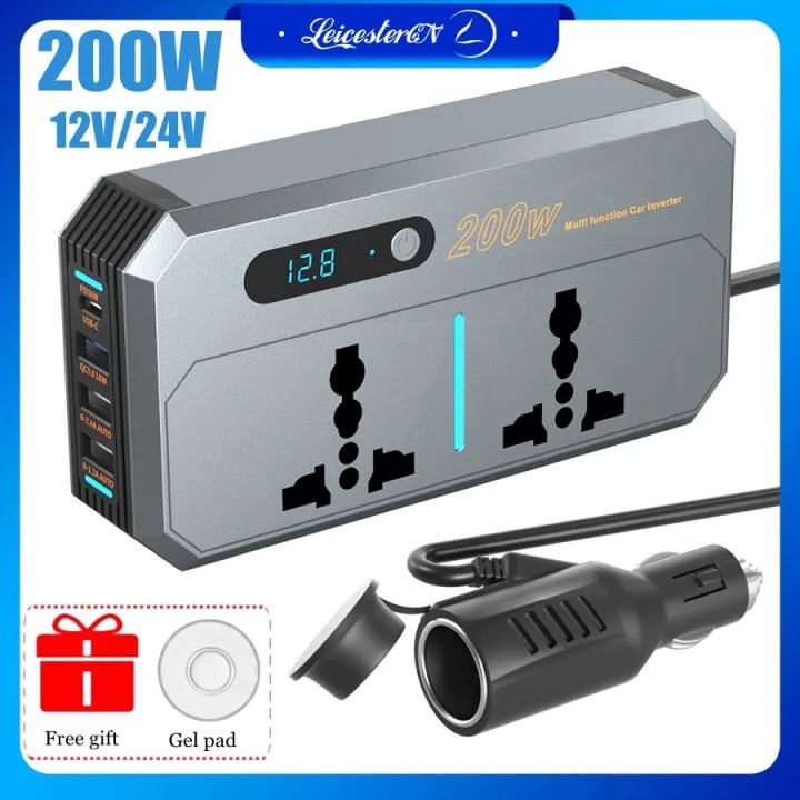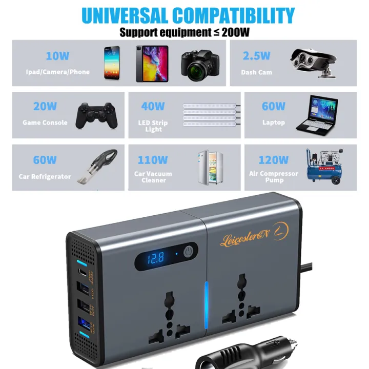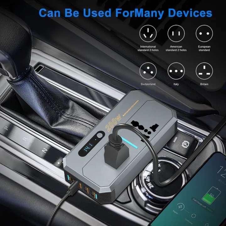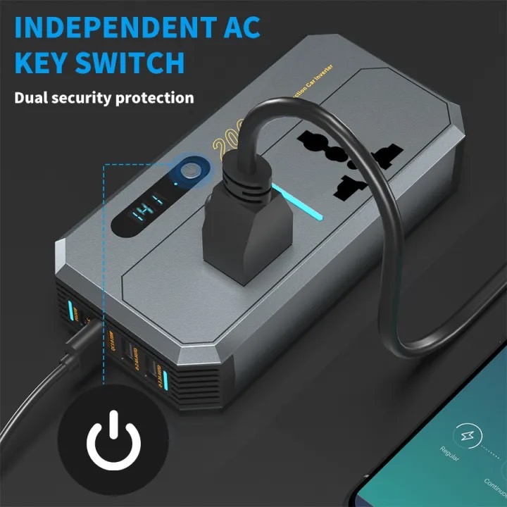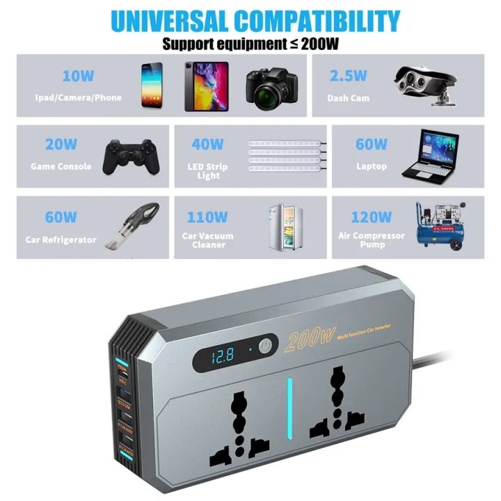 200W nếu sử dụng đồng thời 4 cổng USB và 2 ổ cắm AC. Lưu ý: để tránh làm cháy bộ chuyển nguồn, tổng công suất đầu ra của biến tần không được vượt quá công suất đầu ra tối đa của ổ cắm.