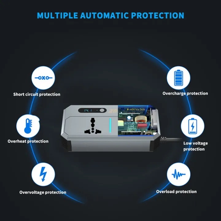 - Công nghệ bảo vệ chống ngắn mạch, bảo vệ chống quá tải, bảo vệ thấp áp và cao áp, có quạt tản nhiệt, bảo vệ chống quá nhiệt...tân tiến nhất nên an toàn tuyệt đối cho ắc quy cũng như các thiết bị của bạn.