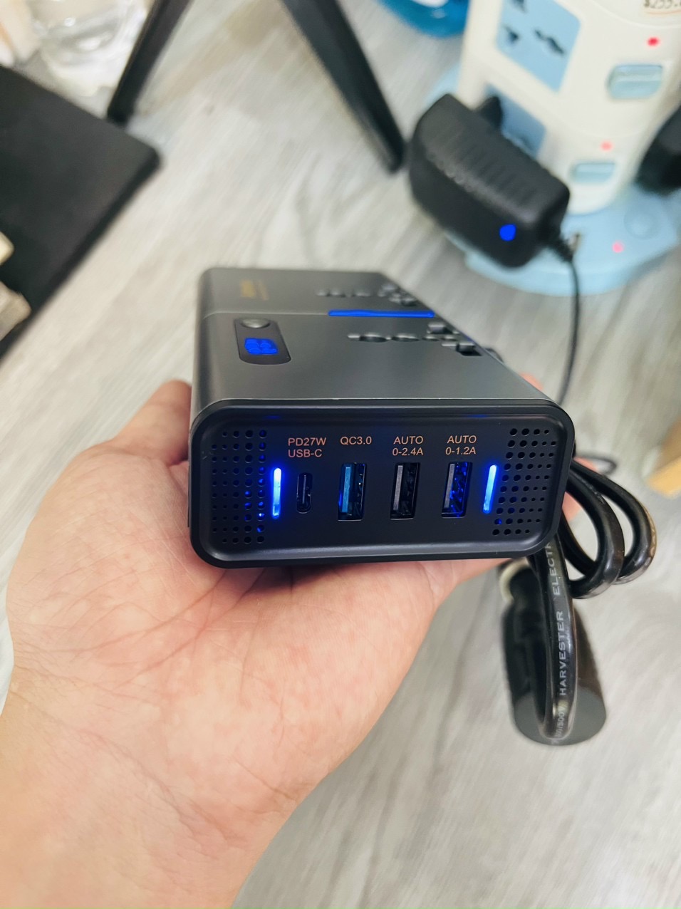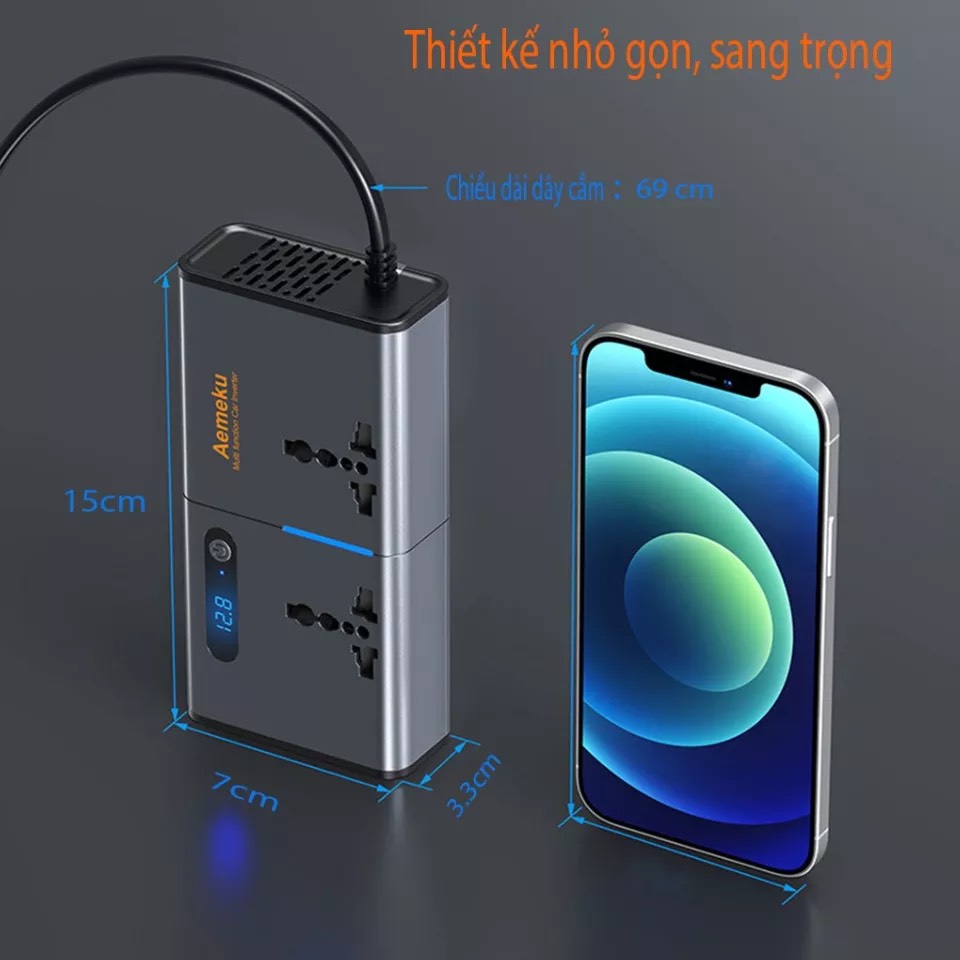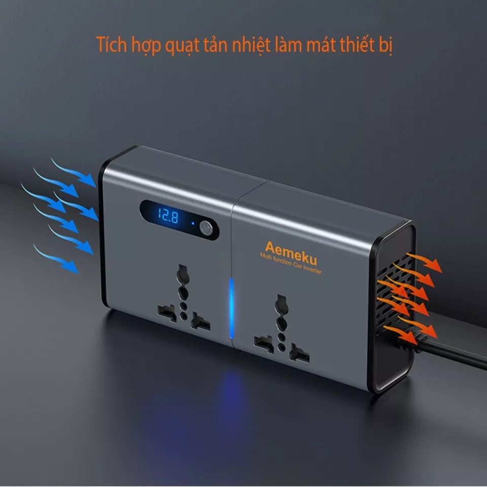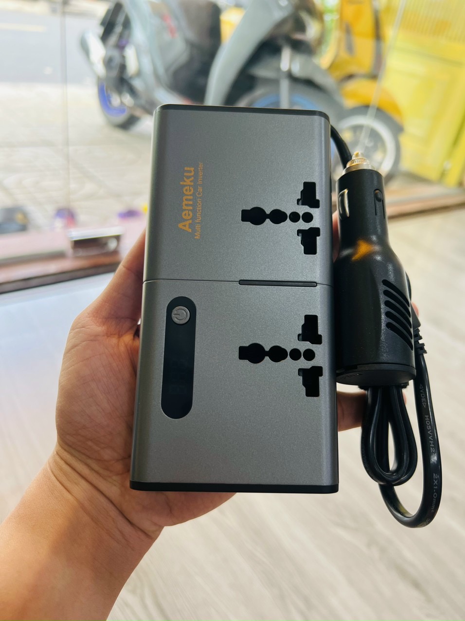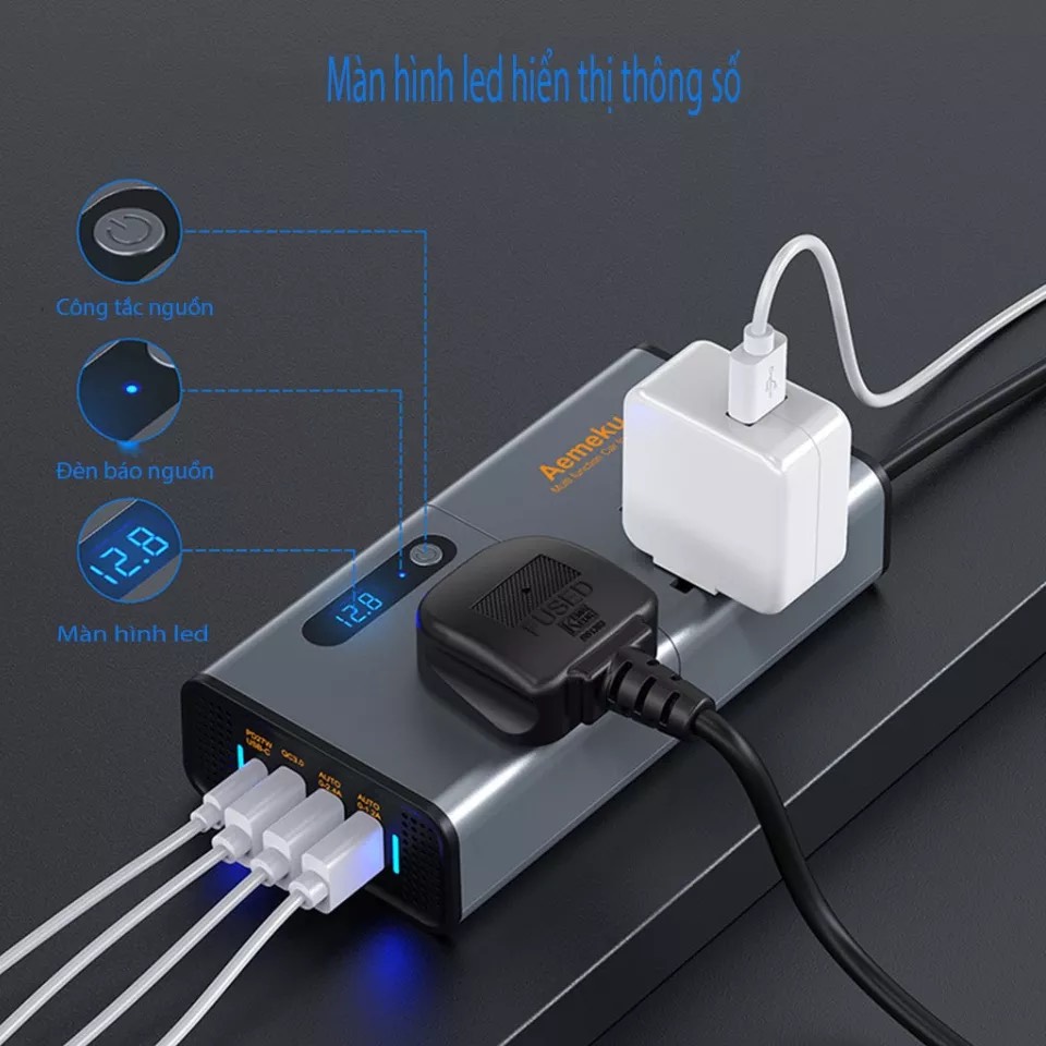 - Bộ đổi nguồn/Biến tần 12v/24v sang 220V AEMEKU chia ra 01 công tẩu, 02 cổng 220v thiết kế chống giật, 01 công sạc nhanh PD công suất 27W, 01 cổng USB sạc nhanh 3.0 và 02 cổng sạc USB giúp bạn kết nối nhiều thiết bị cùng lúc. Sản phẩm tích hợp quạt tản nhiệt duy trì nhiệt độ ổn định cho thiết bị.