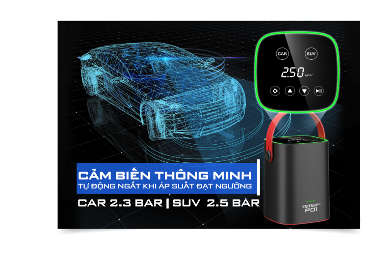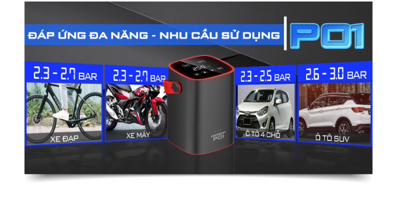 VIETMAP P01 thiết bị Bơm điện tử đa năng đáp ứng nhu cầu sử dụng đa dạng, dùng để bơm lốp ô tô, xe máy, xe đạp, nệm hơi, vật dụng gia đình đều rất phù hợp và đơn giản.