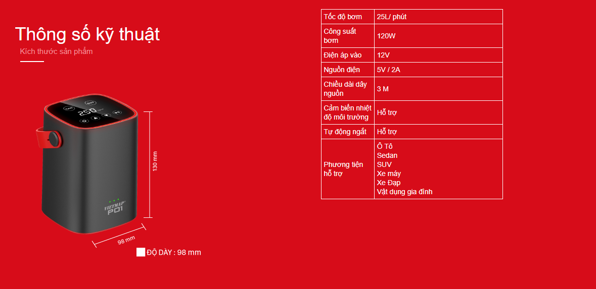 VIETMAP P01 được thiết kế nhỏ gọn, thuận tiện khi mang đi và cất giữ trong cốp xe, giúp người sử dụng có thể yên tâm kiểm tra và điều chỉnh áp suất bánh xe ngay tại chỗ, trên mọi hành trình.