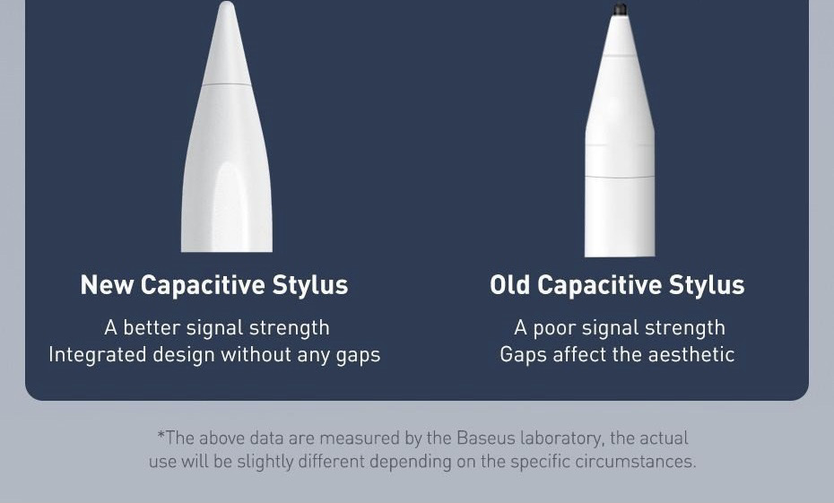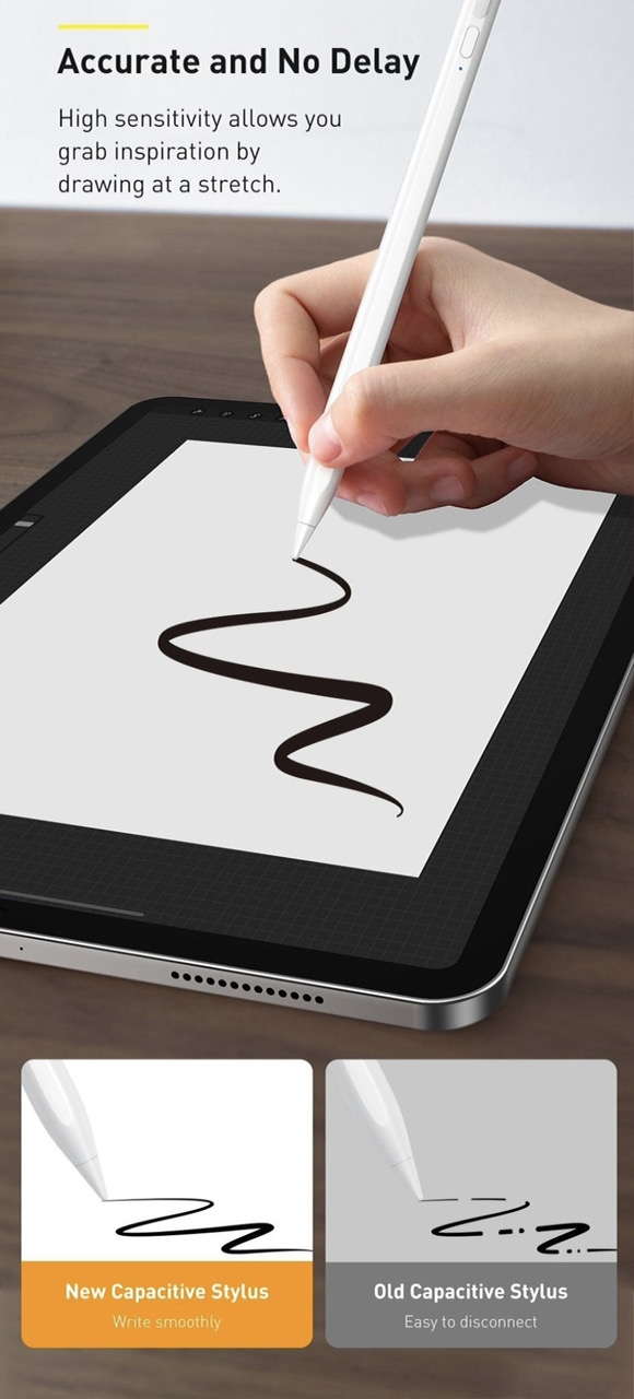 - Bút cảm ứng Baseus Smooth Writing Capacitive Stylus được trang bị Sensor cảm ứng độ nghiên của thân bút và lực nhấn khi sử dụng để tạo ra các nét vẻ đậm nhạt khác nhau. Mang đến trải nghiệm sử dụng như bút thật. Sản phẩm có 2 phiên bản Standard (chỉ dùng được trên các dòng iPad Pro) và Plus (được trang bị thêm 1 đầu cảm ứng thứ 2 , tương thích với hầu tư tất cả các loại màn hình cảm ứng điện dung trên Smartphone/ Tablet Android ). Thân bút cũng được trang bị nam châm, có thể hít được trên khung viền đối với iPad các dòng có hỗ trợ.