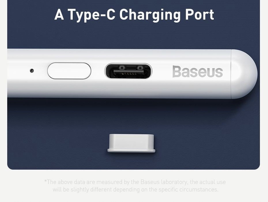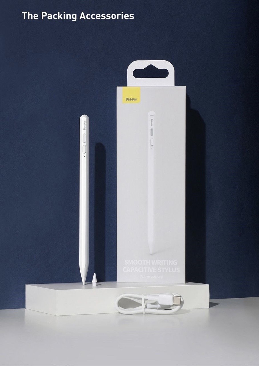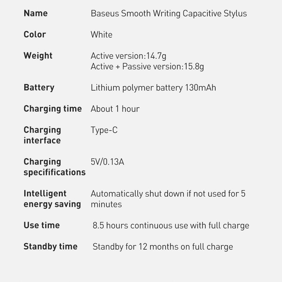 2. Name: Baseus Smooth Writing Capacitive Stylus (Active + Passive version) White (Containing universal TypeC 3A 0.5m USB wire in white*1, Active tip*1, Passive tip cap*1) 3. Material: Aluminum alloy+ Plastic