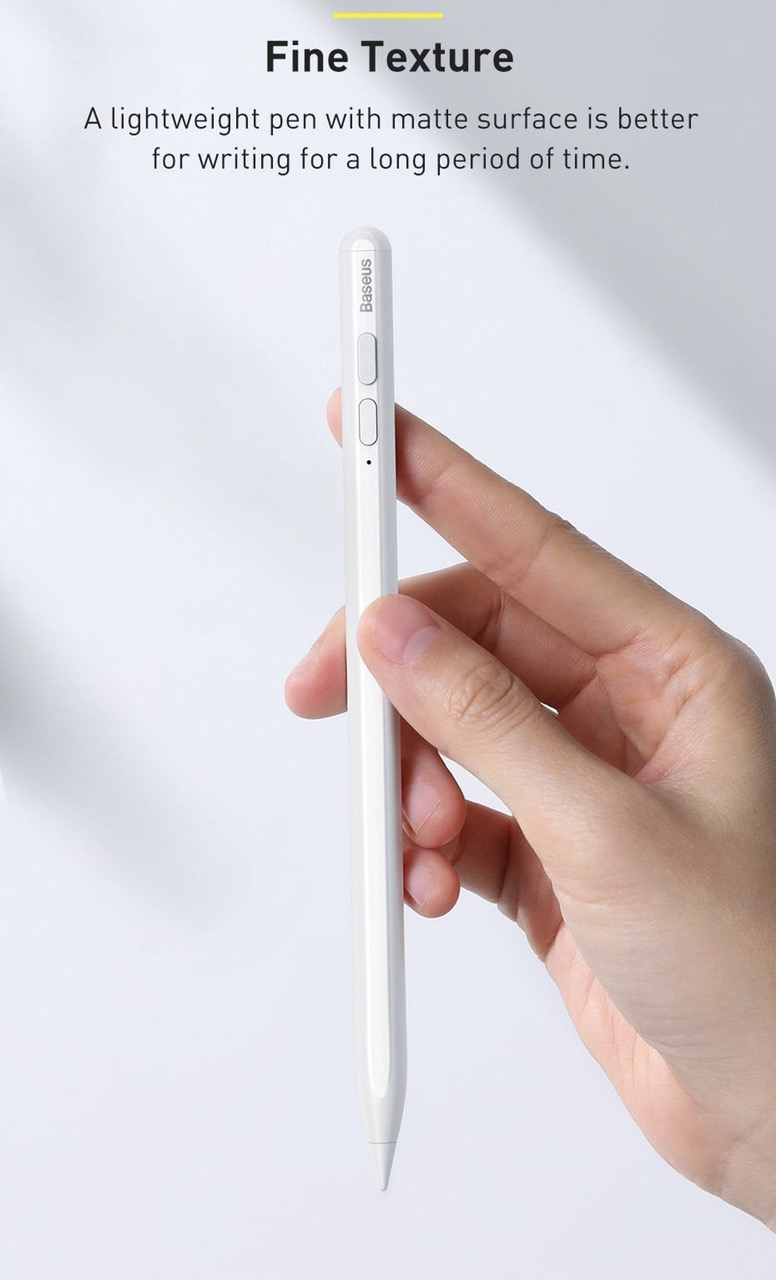 - Baseus Smooth Writing Capacitive Stylus có thân bút làm bằng kim loại bên ngoài được phủ sơn tỉnh điện cao cấp với tông màu trắng chủ đạo , thiết kế thon gọn có nhiều nét tương đồng với chiếc bút Apple Pencil . Chất liệu , thiết kế , tông màu tất cả đều mang ngôn ngữ thiết kế của các sản phẩm Apple. Khi đi kèm với iPad và Macbook tạo sự đồng bộ, đẳng cấp và sang trọng.