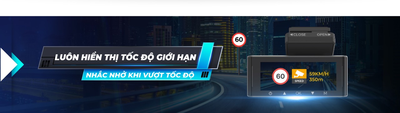 VIETMAP SpeedMap M1 dòng camera hành trình VIETMAP đầu tiên và duy nhất trên thị trường trang bị tính năng luôn hiển thị tốc độ giới hạn của tuyến đường di chuyển khi lái xe, đồng thời cảnh báo bằng hình ảnh & giọng nói khi tốc độ di chuyển cao hơn tốc độ cho phép.