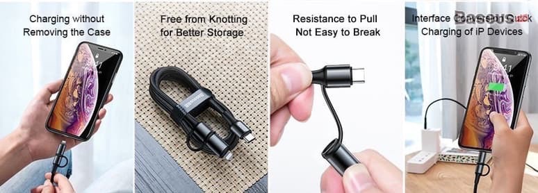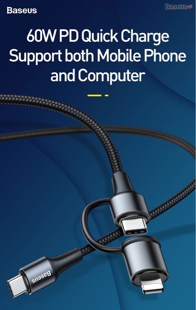 - Cáp sạc nhanh Baseus Twins 2 in 1 tích hợp 3 đầu kết nối Type C và Lightning dùng sạc pin và đồng bộ dữ liệu tốc độ cao cho iPhone/iPad, smarphone hoặc table Android, Macbook...