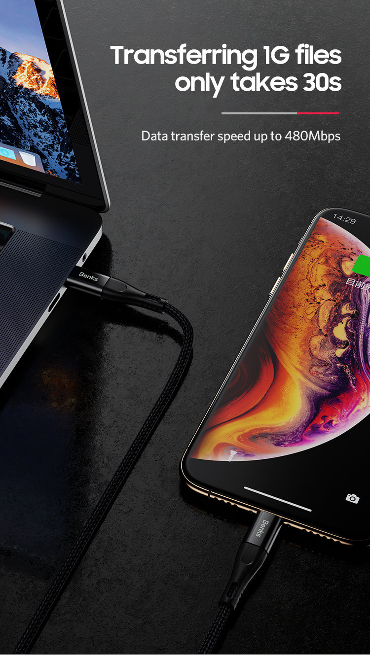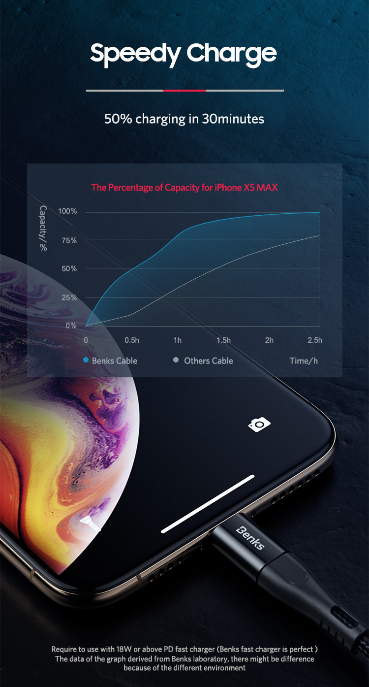 Hỗ trợ sạc nhanh lên đến 3A (tối đa), có thể sạc nhanh pin từ model iPhone 8 trở lên từ 0% đến 50% trong 30 phút (với Bộ sạc PD USB-C) Cáp Benks hỗ trợ chuẩn sạc nhanh PD 18W và đồng bộ hóa dữ liệu lên tới 480Mbps.