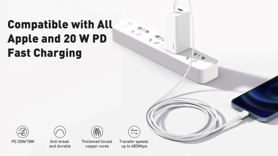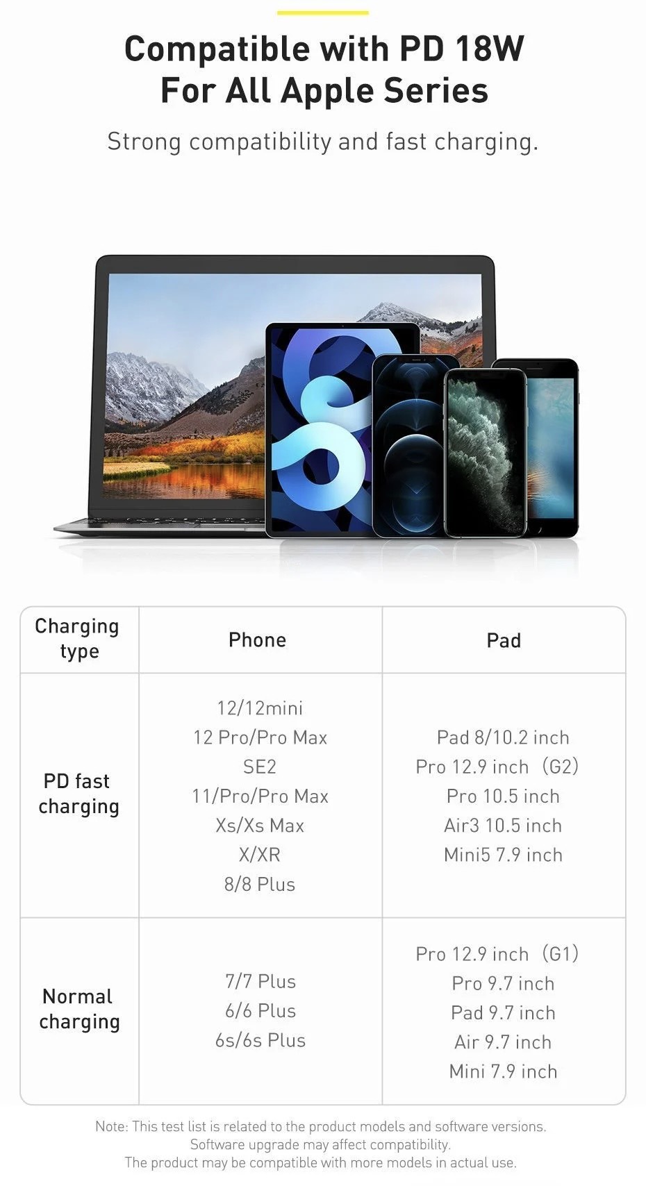 - Cáp hỗ trợ sạc nhanh chuẩn PD (Power Delivery) chuẩn mới nhất với công suất lên đến 20W (iPhone 12), có thể tương tích cả chuẩn PD 18W trên iPhone 11 Series trở về trước nhờ vào chip xử lý nguồn điện thông minh có thể nhận dạng được thiết bị để điều chỉnh nguồn điện ngỏ ra phù hợp . Sản phẩm dùng sạc pin cho cả iPhone và iPad với tốc độ cực cao và vẫn đảm bảo an toàn .