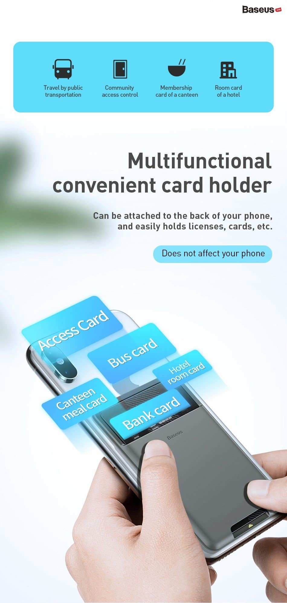 - Thiết kế thông minh, siêu mỏng và nhỏ gọn (chỉ 92mm * 60mm) , dùng dán vào lưng điện thoại. Đảm bảo nhanh chóng và thuận tiên khi sử dụng nhất là các loại thẻ thường xuyên sử dụng .