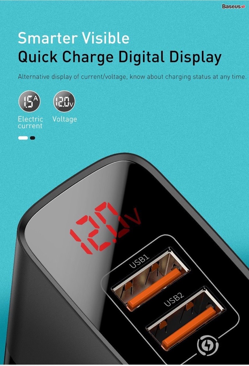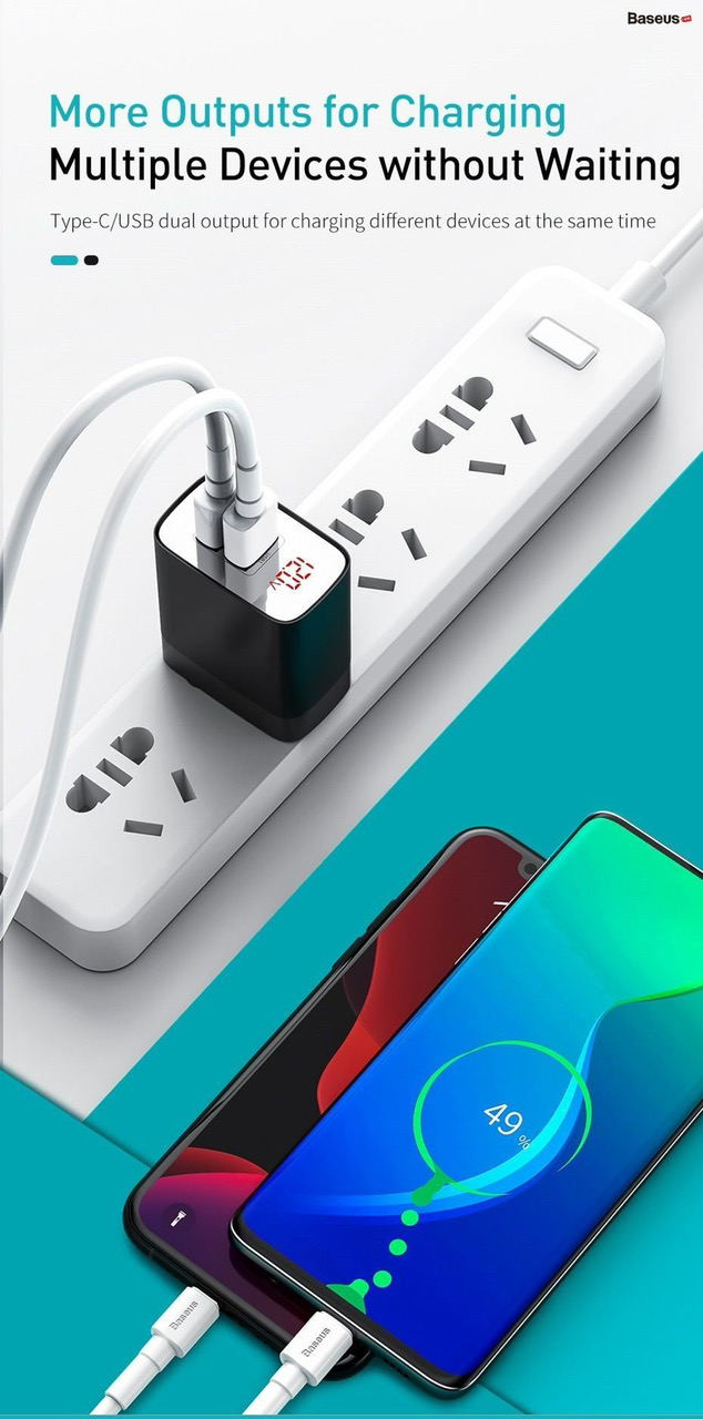 - Củ sạc nhanh đa năng Baseus Mirror Lake PPS Digital có 2 cổng sạc Dual USB, cả 2 cổng sạc đều hỗ trợ sạc nhanh chuẩn QC3.0.
