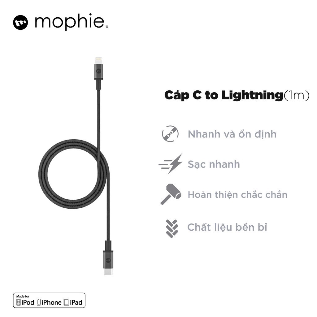 Cáp Mophie C to Lightning 1M được thiết kế với đầu cáp được bao bọc bởi một lớp kim loại cao cấp cùng dòng chữ Mophie tinh gọn, đẹp mắt.