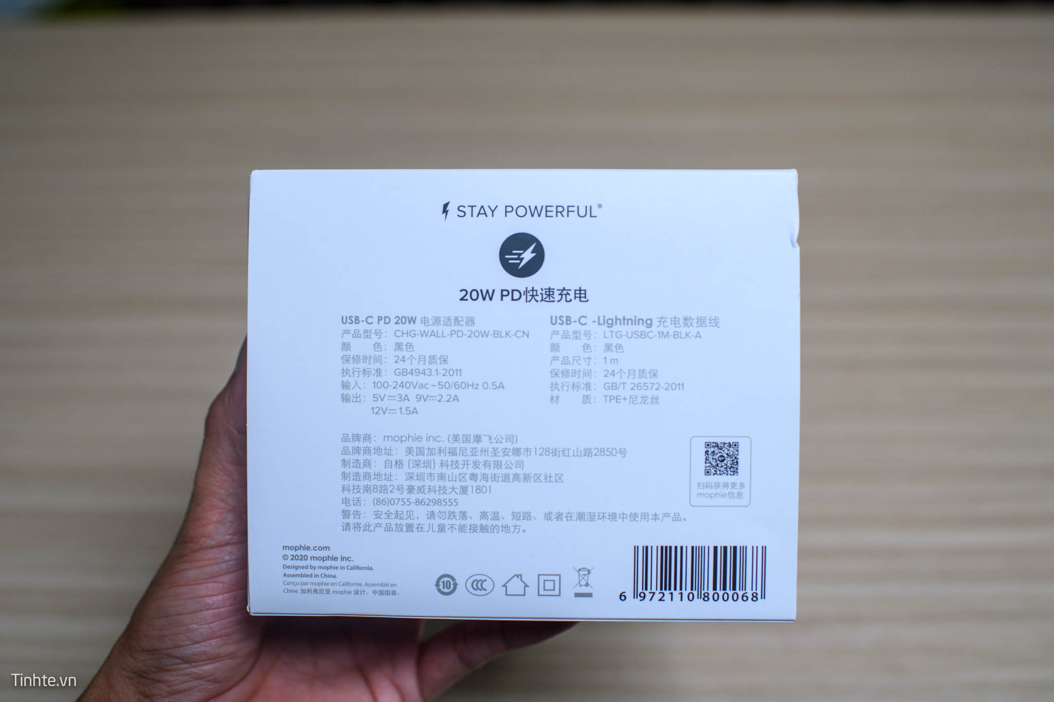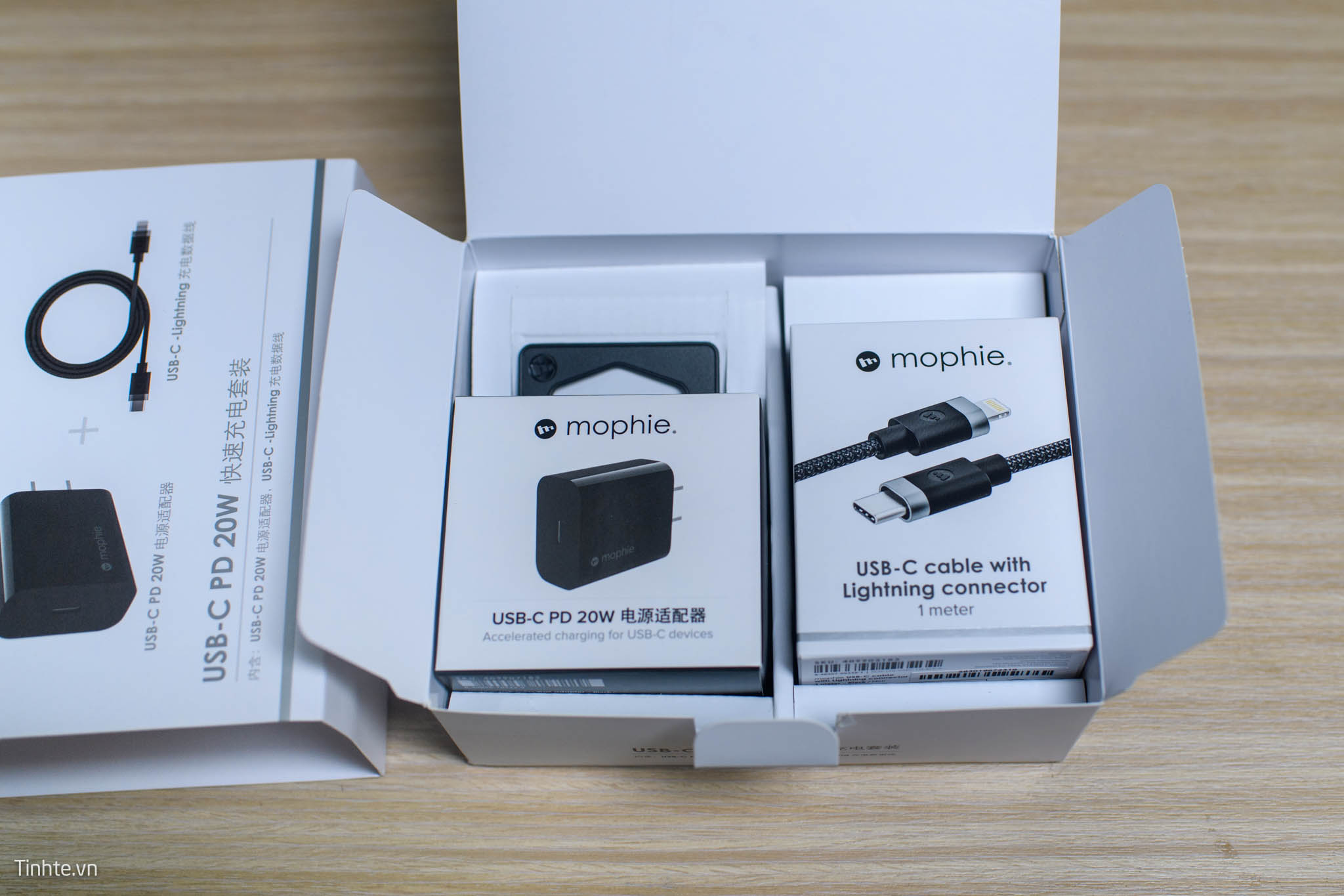 Tương tự như một bộ mà Mophie tặng bán trước đây, chỉ có điều là dung lượng được tăng lên thành 20W, có lẽ để tối ưu cho iPhone 12 hay nhắm trực tiếp vào khách hàng sử dụng iPhone 12. Cục sạc Mophie 20W hỗ trợ sạc PD và kèm theo 3 Profile sạc nhanh là: 5V-3A, 9V-2.2A, 12V-1.5A, dải Profile này hoàn toàn tương thích để tối ưu công suất sạc cho những sản phẩm iDevice mới ra mắt gần đây.