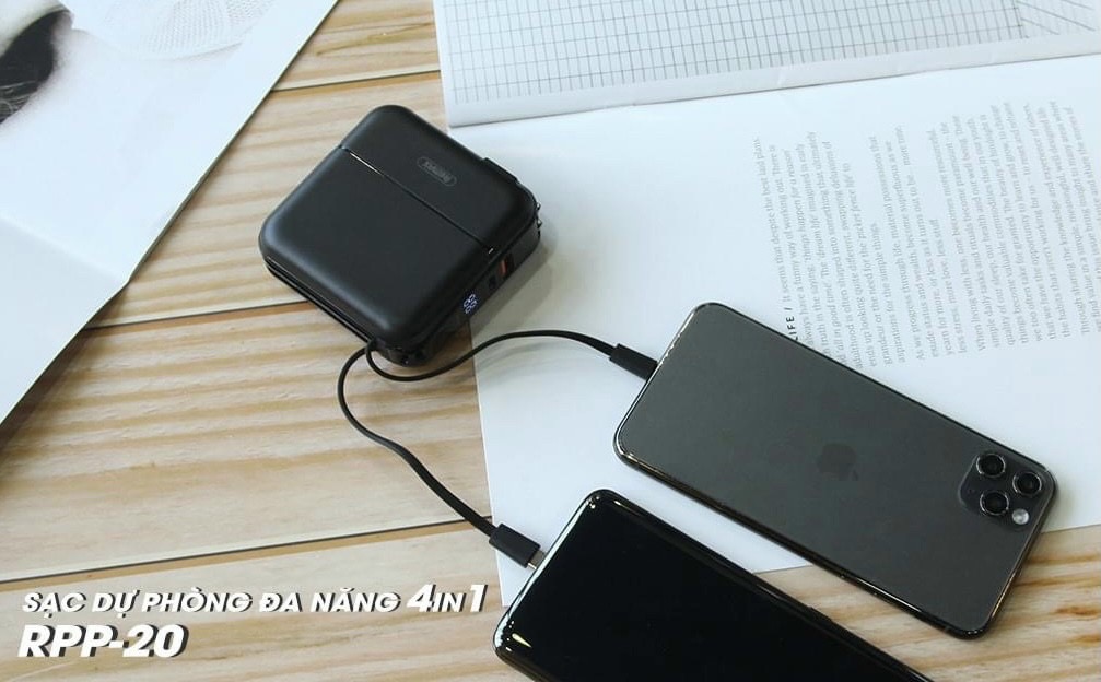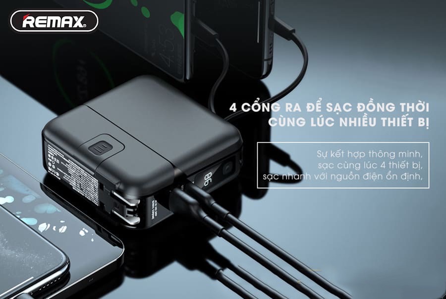 Củ sạc kiêm pin sạc dự phòng Remax có đầu ra cổng kép USB và đầu Type-C, tương thích với nhiều thiết bị. Ở chế độ pin dự phòng và chế độ củ sạc có 2 dây sạc chân cắm lightning và Type-C thuận tiên khi sạc mà không lo đến dây sạc.
