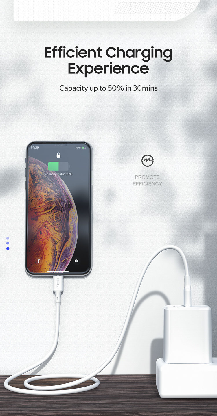 2. Hỗ trợ sạc nhanh từ iPhone 8 trở lên từ 0-50% trong 30 phút với cáp Orginal Benks For Apple USB-C to Lightning.