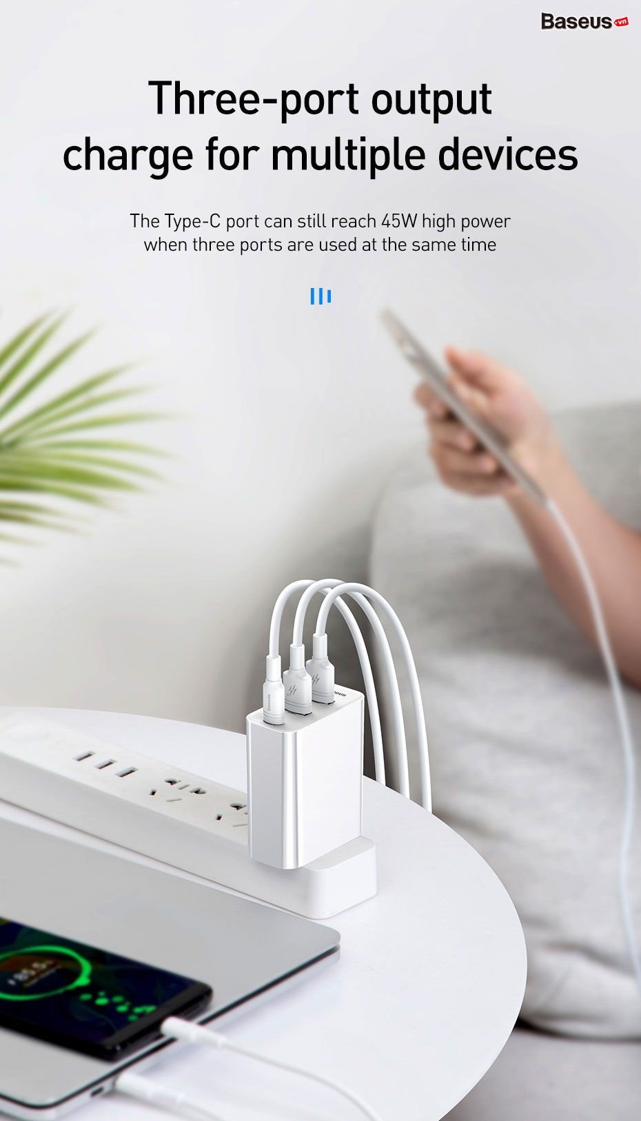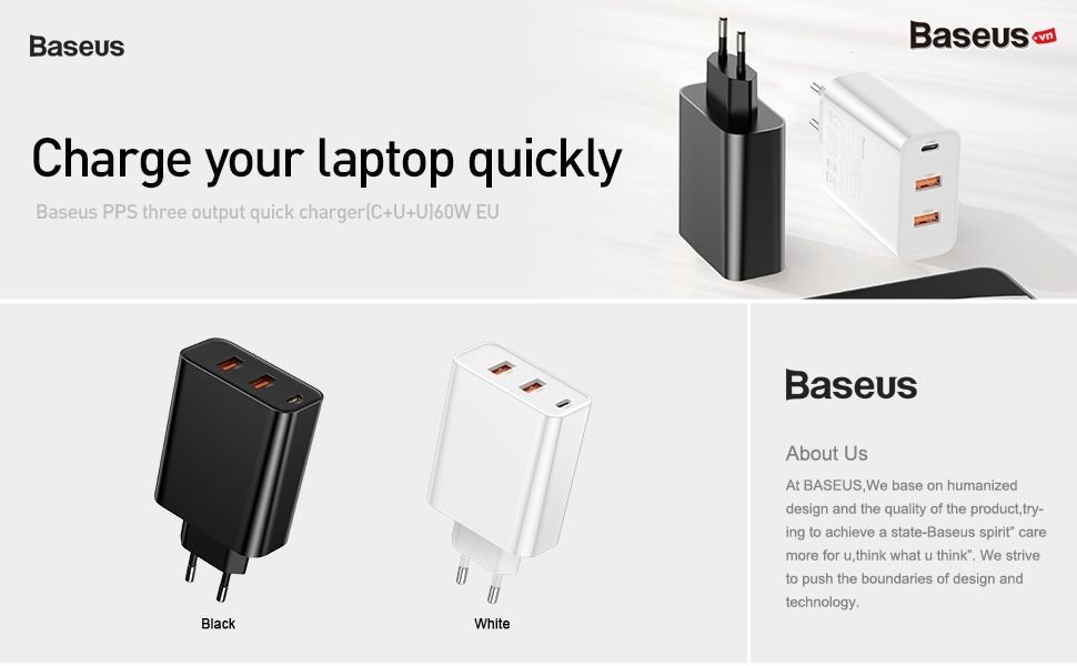 - Bộ sạc nhanh đa năng Baseus PPS Quick Charger với công suất sử dụng lên đến 60W hỗ trợ nhiều chuẩn sạc nhanh mới nhất hiện nay cho phép bạn có thể kết nối và sạc pin cho nhiều thiết bị khác nhau cùng lúc như iPhone/ ipad, smartphone, Tablet và cả Laptop