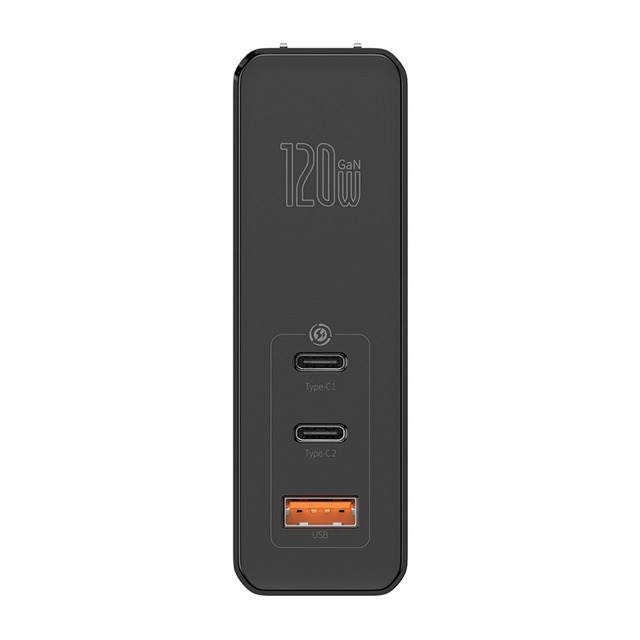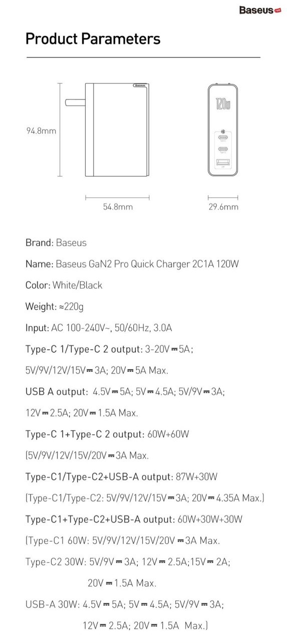 - Thiết kế của bộ sạc nhanh Baseus GaN 120W là sự kết hợp giữa nhựa bóng và nhựa nhám tạo nên sự tinh tế, đơn giản. Sản phẩm có kích thước chỉ bằng một chiếc thẻ ATM và có 2 tùy chọn màu cho người dùng lựa chọn là trắng và đen. Bộ sạc có 3 cổng sạc gồm 2 cổng USB type-C và 1 cổng USB-A để người dùng có thể sạc cùng lúc nhiều thiết bị. Khi sạc 1 thiết bị, công suất sạc ở cổng đơn có thể lên đến 100W.