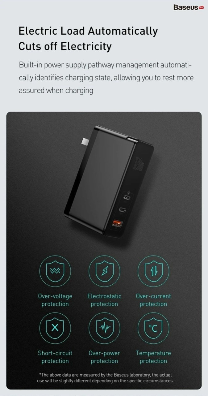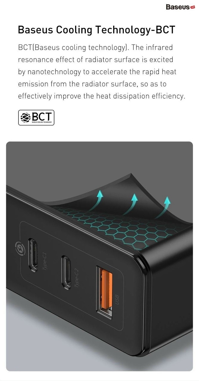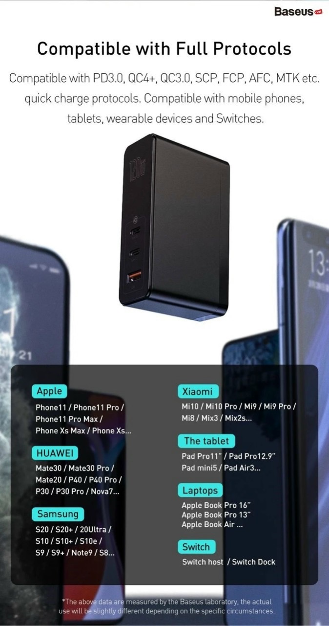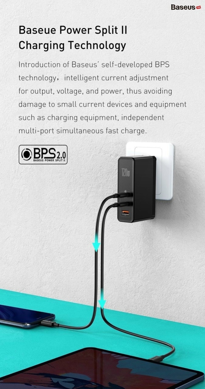 - Cốc sạc Baseus GaN 120W được trang bị công nghệ BPS 2.0 có thể tự điều chỉnh dòng điện đầu ra một cách thông minh để phù hợp với thiết bị được sạc, tránh hư hỏng thiết bị. Cốc sạc hỗ trợ chuẩn sạc nhanh PD 3.0, QC 3.0, QC 4.0, SCP, FCP...được trang bị trên các thiết bị điện thoại, máy tính bảng, laptop...