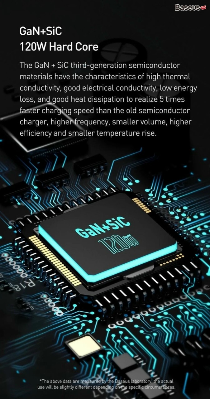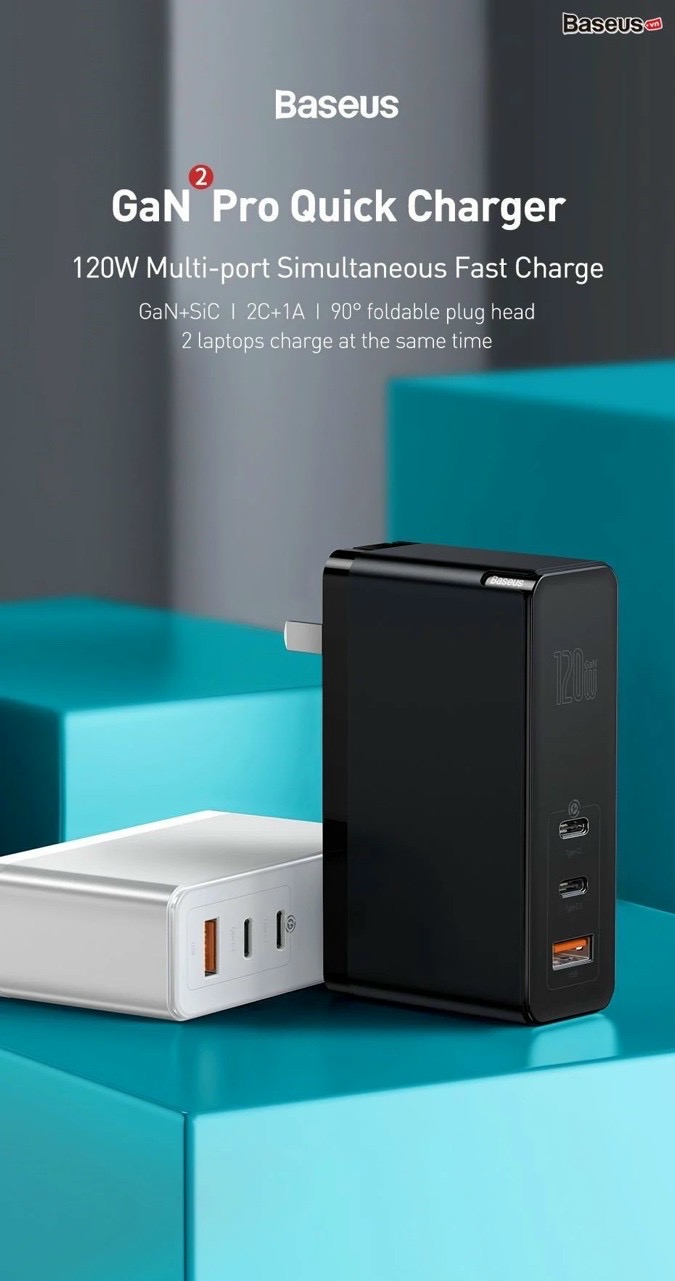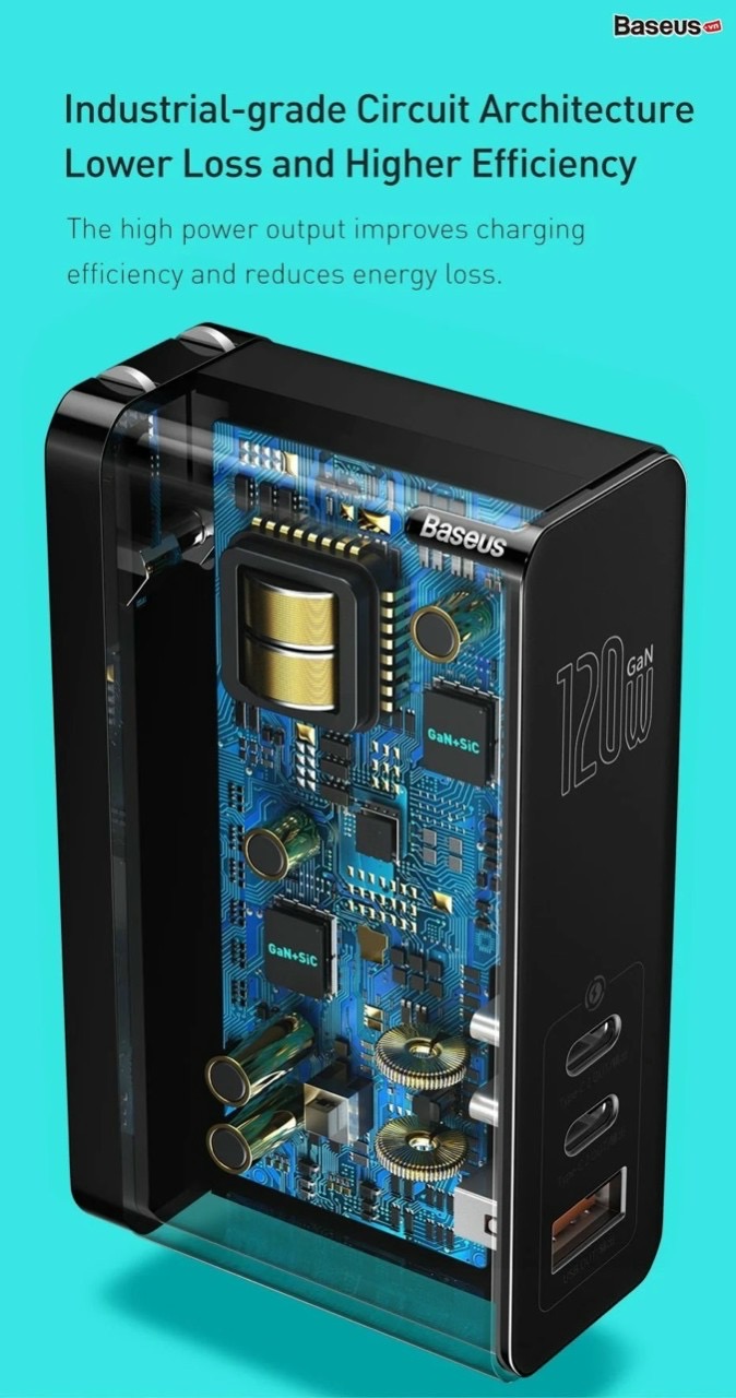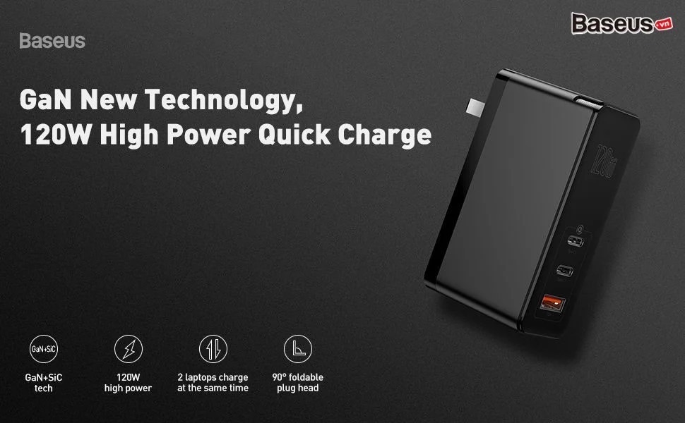 - Một bộ cốc sạc nhanh với công suất lớn lên đến 120W mang thương hiệu Baseus vừa được ra mắt. Đây là một bộ sạc nhanh sử dụng công nghệ sạc GaN (Gallium Nitride) kết hợp với mô-đun nguồn SiC (Silicon Carbibe) để cốc sạc có kích thước nhỏ gọn mà công suất lớn.