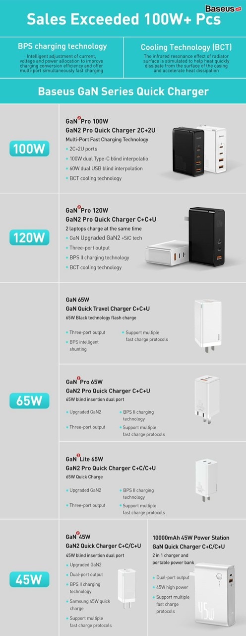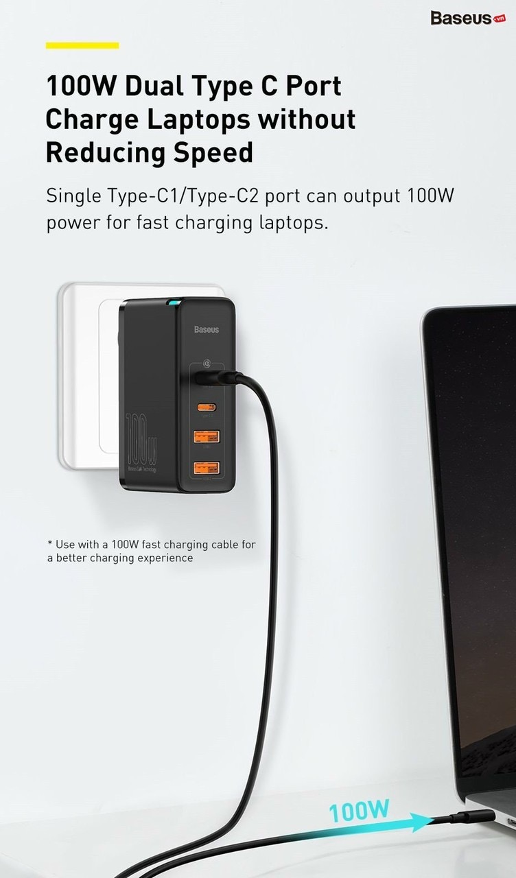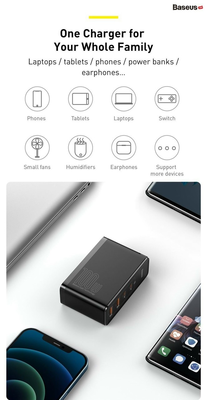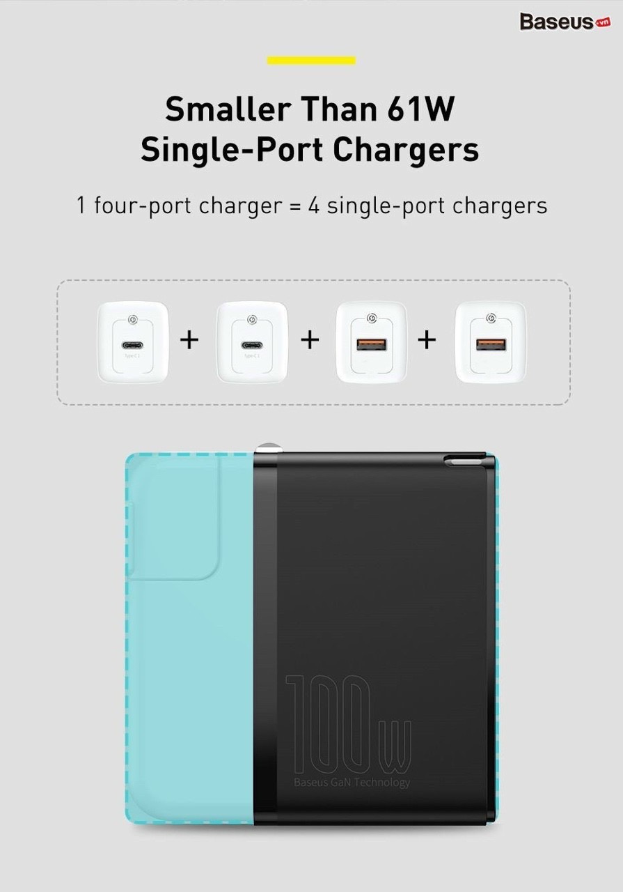 - Sản phẩm kế thừa những ưu điểm vốn có của dòng sạc công nghệ GaN đó là công suất sử dụng cực lớn lên đến 100W nhưng với 1 kích thước vô cùng nhỏ gọn, dễ dàng mang theo mọi nơi.