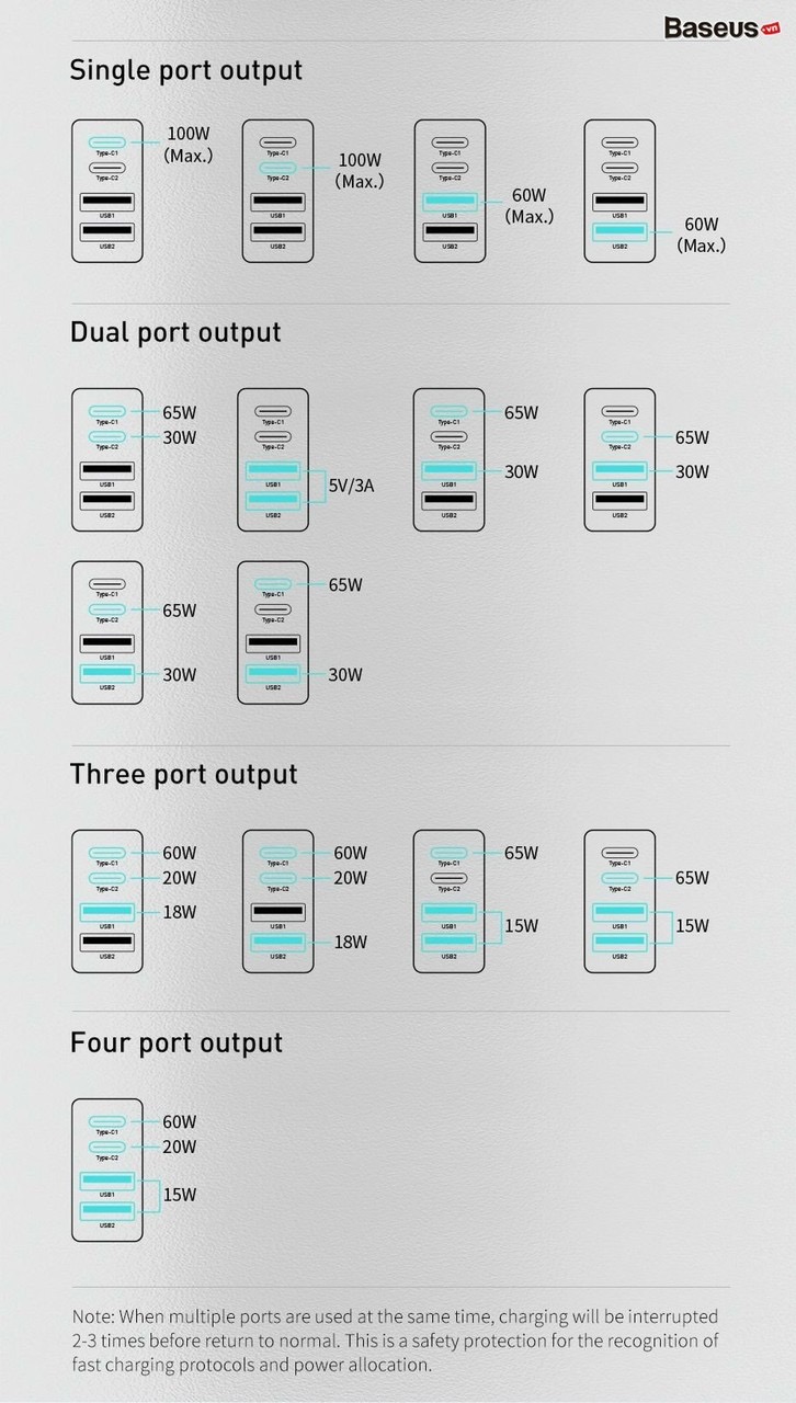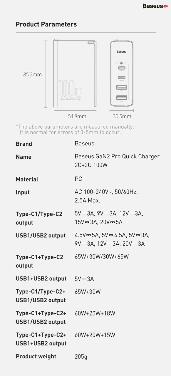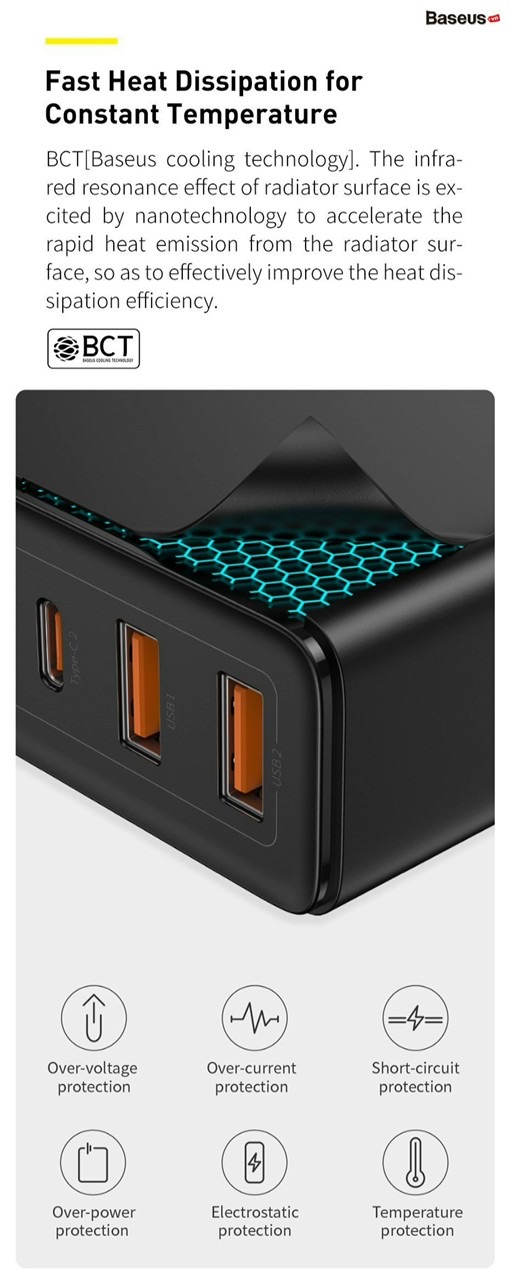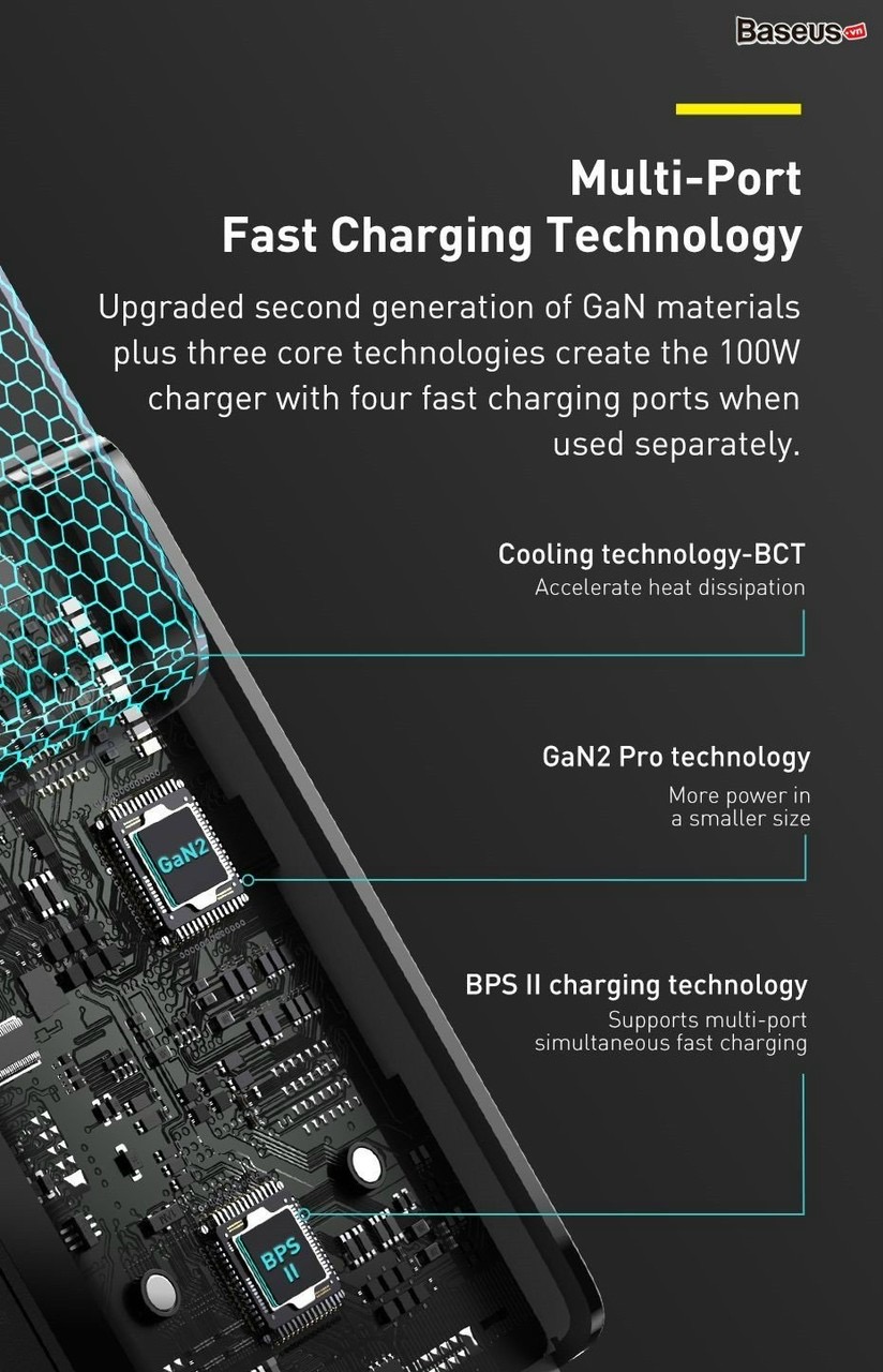 - Bộ sạc nhanh Baseus GaN2 Pro Quick Charger 4 Ports sử dụng vật liệu bán dẫn GaN thế hệ thứ 2 giúp cải thiện đáng kể hiệu suất sử dụng, tăng ổn định và khắc phục các nhược điểm của thế hệ trước đó. Khả năng bảo vệ thông minh, kiểm soát quá dòng, quá áp, quá nhiệt, chống rò điện và ngắn mạch. Bảo đảm tính ổn định cao và an toàn tuyệt đối cho thiết bị và người sử dụng.
