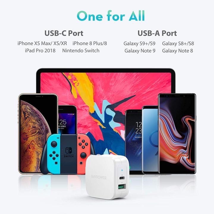 * Adapter Sạc 2 Cổng 18W RAVPower RP-PC110 Tích hợp USB Type C Hỗ Trợ PowerDelivery PD hoàn hảo cho thế giới đa thiết bị hiện nay. Bộ sạc nhỏ gọn nhưng mạnh mẽ này chỉ mất một ổ cắm điện nhưng sạc cùng lúc hai điện thoại thông minh / máy tính bảng yêu thích của bạn.