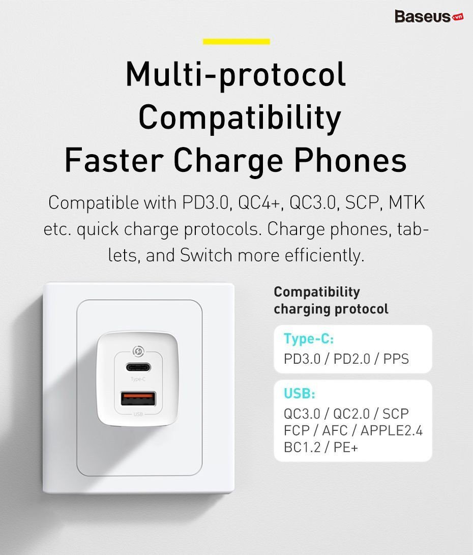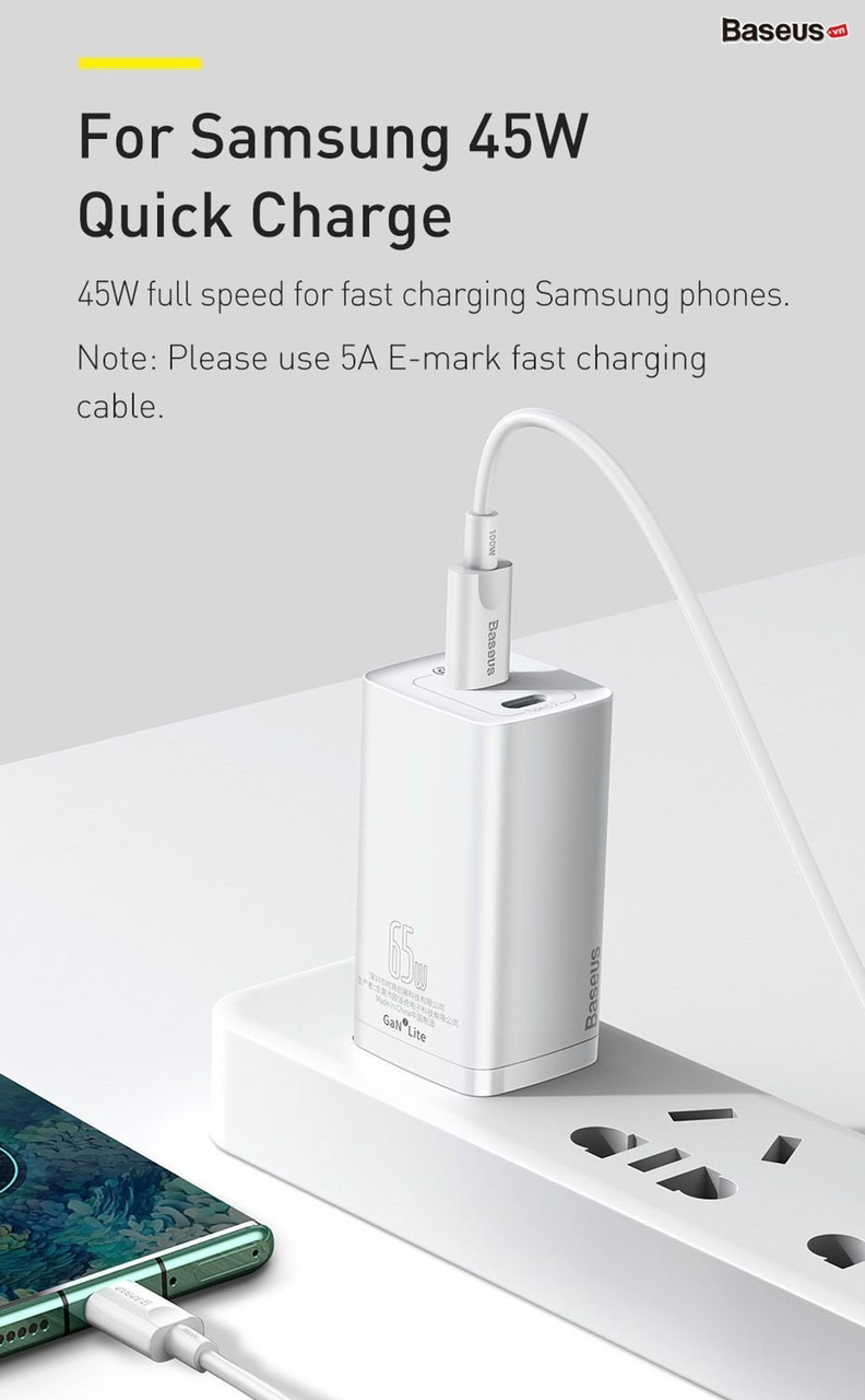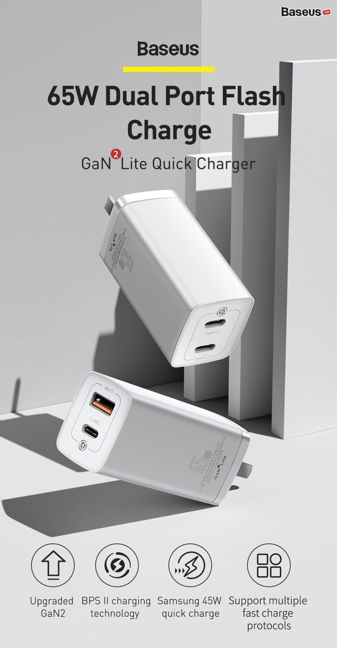 Tính năng cơ bản Cốc sạc siêu nhanh, nhỏ gọn Baseus GaN2 LiteQuick Charger 65W (Type C+ USB Port , PD3.0/ PPS/ QC4.0/SCP/ FCP Multi Quick Charge Protocol, GaN2 Technology.