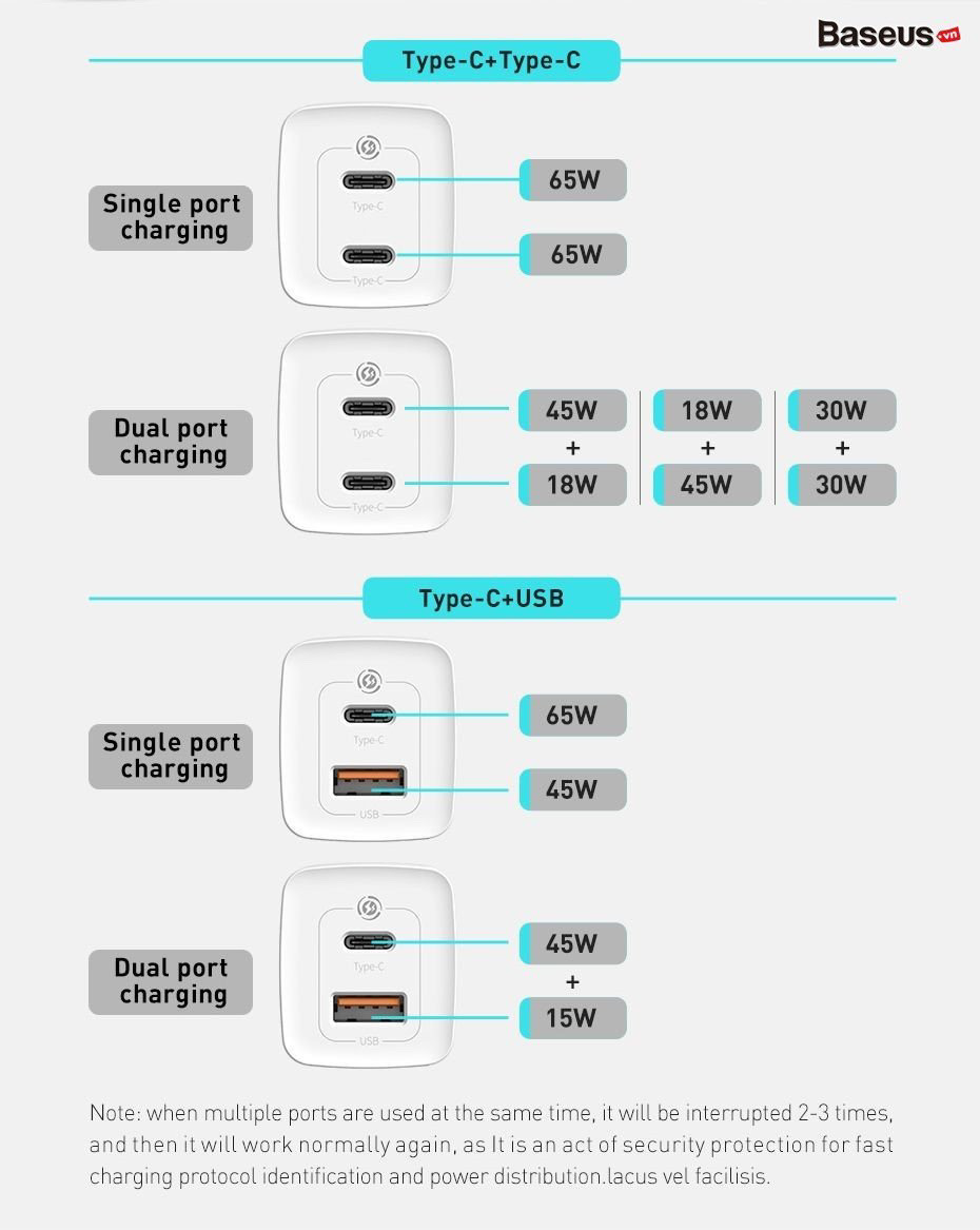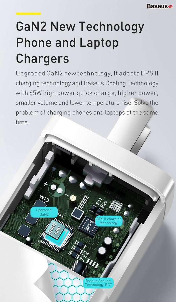- Bên trong gồm bộ vi xử lý hiện đại với khả năng chuyển đổi dòng điện ra phù hợp với thiết bị sạc, với công suất lên đến 65W thì việc sạc cho các thiết bị như điện thoại, tablet, pin dự phòng hay cả ultrabook như Macbook, Matebook,...