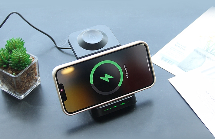 Đế sạc được trang bị công suất lớn lên đến 23.5W, cho khả năng sạc nhanh chóng, giúp tiết kiệm thời gian và không cần phải lo lắng về việc sạc từng thiết bị một.