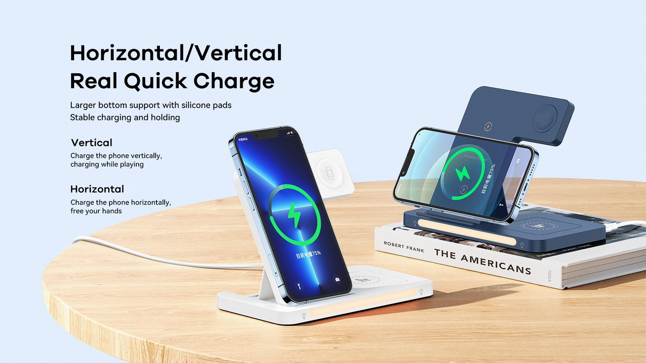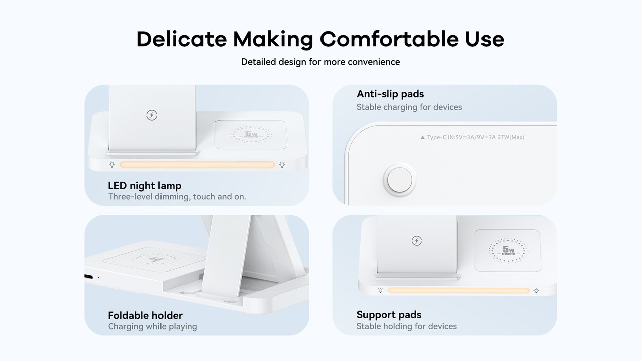 Đế sạc được thiết kế có giá đỡ có thể mở ra và gấp lại dễ dàng, có đèn báo trạng thái sạc. Ngoài ra thiết bị còn được trang bị chip thông minh để kiểm soát nguồn điện.