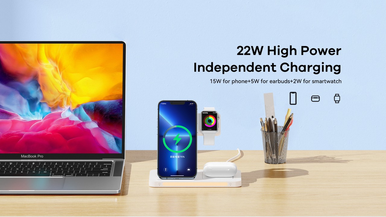Bộ sạc không dây Wireless Charger 3in1, sạc không dây Qi cho điện thoại, đồng hồ apple watch, tai nghe airpods và các loại tai nghe có hỗ trợ tính năng sạc không dây.
