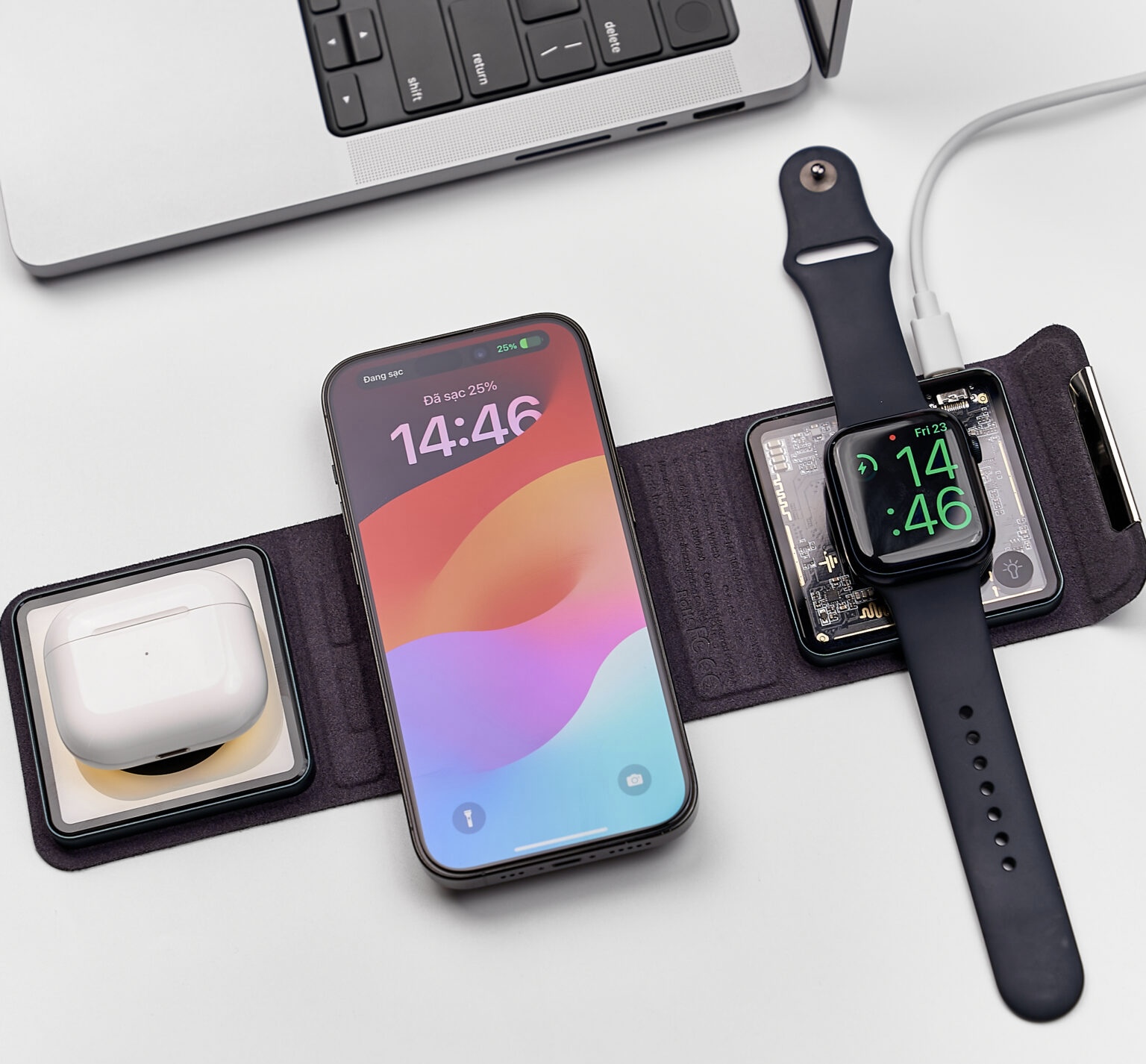 Đế sạc không dây cho phép sạc điện thoại (tối đa 15W) + Tai nghe (5W) + Đồng hồ (2.5W) hoặc 2 iPhone (7.5W) + Apple Watch (2.5W); hoạt động với đầu vào của bộ sạc tường 20W trở lên, bao gồm cáp sạc USB Type-C