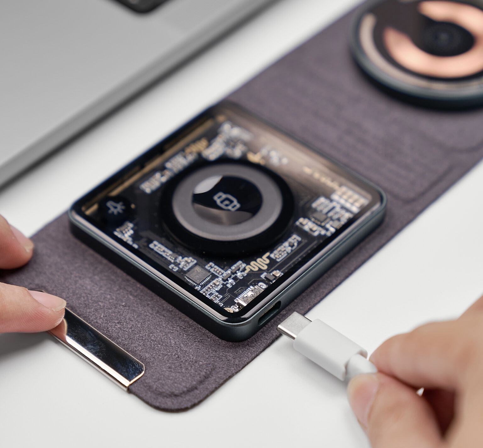 Có thể nhìn thấy cuộn dây sạc không dây, nam châm căn chỉnh chắc chắn và các bộ phận thông qua kính cường lực, trong suốt và có đường viền 2.5D mịn, cùng với viền nhôm không bao giờ gỉ và lớp vải bọc gấp