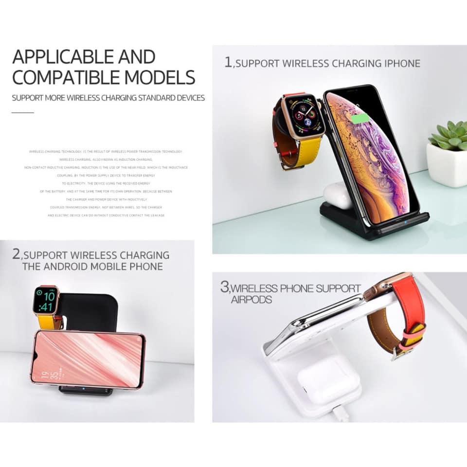 - Hỗ trợ sạc không dây chuẩn Qi cho 3 thiết bị: iPhone - AppleWatch 1/2/3/4 - Airpods 2 (không dây)
