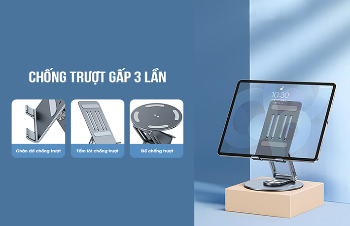 Nhằm đảm bảo thiết bị di động của bạn được an toàn, nhà sản xuất đã trang bị các miếng lót silicon chống trượt ở ba vị trí: chân đỡ, mặt giá đỡ và chân đế. Miếng lót ở phần chân đỡ và mặt giá đỡ giúp cố định điện thoại, máy tính bảng trên giá tránh rơi rớt khi va chạm. Còn miếng lót ở chân đế có chức năng tạo độ bám chắc chắn, chống trơn trượt trên các bề mặt phẳng trơn như gương, kính và thủy tinh.