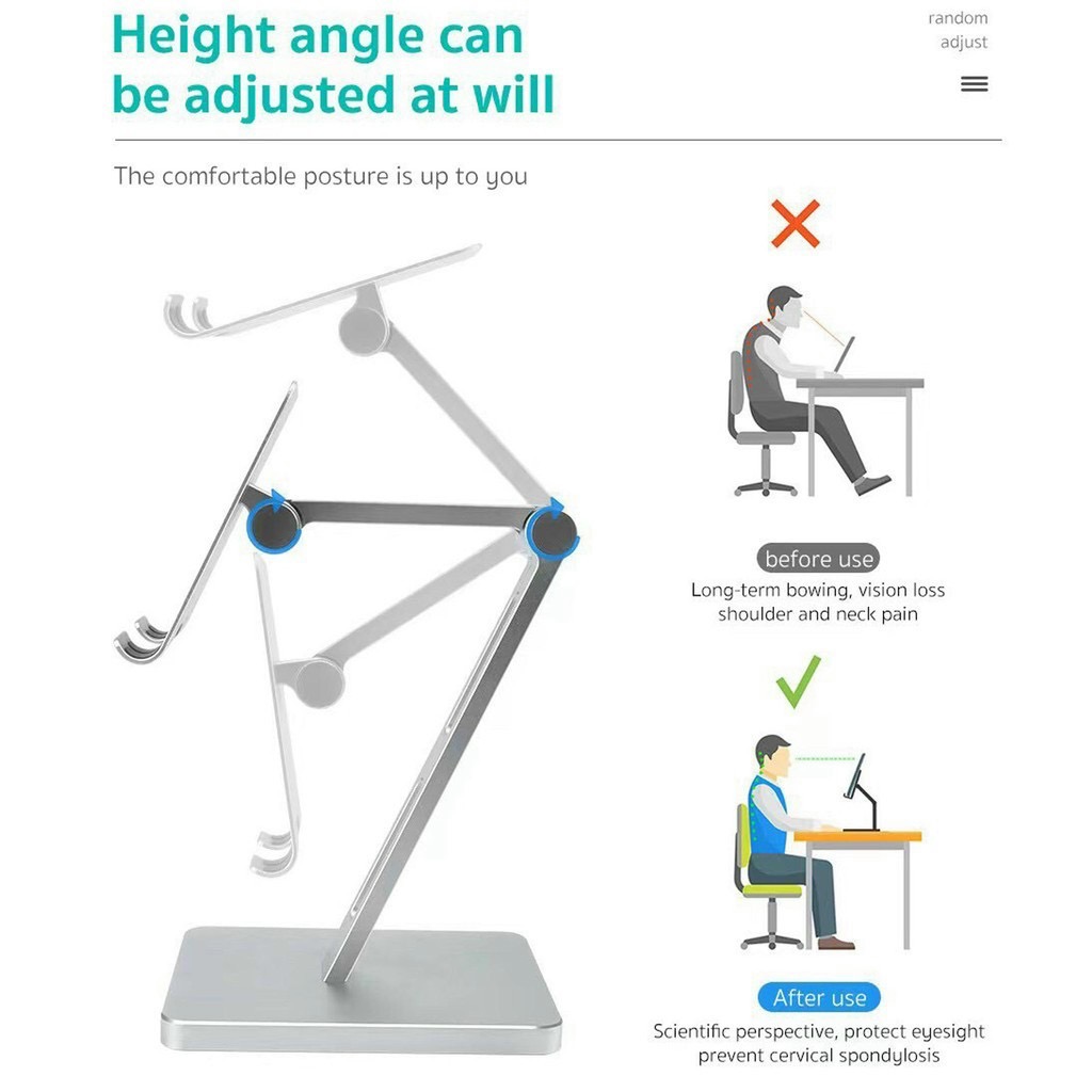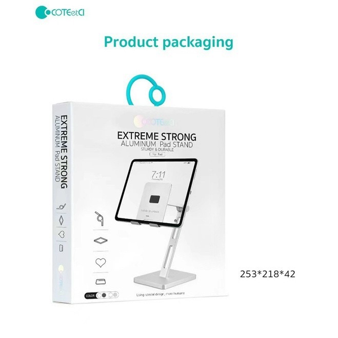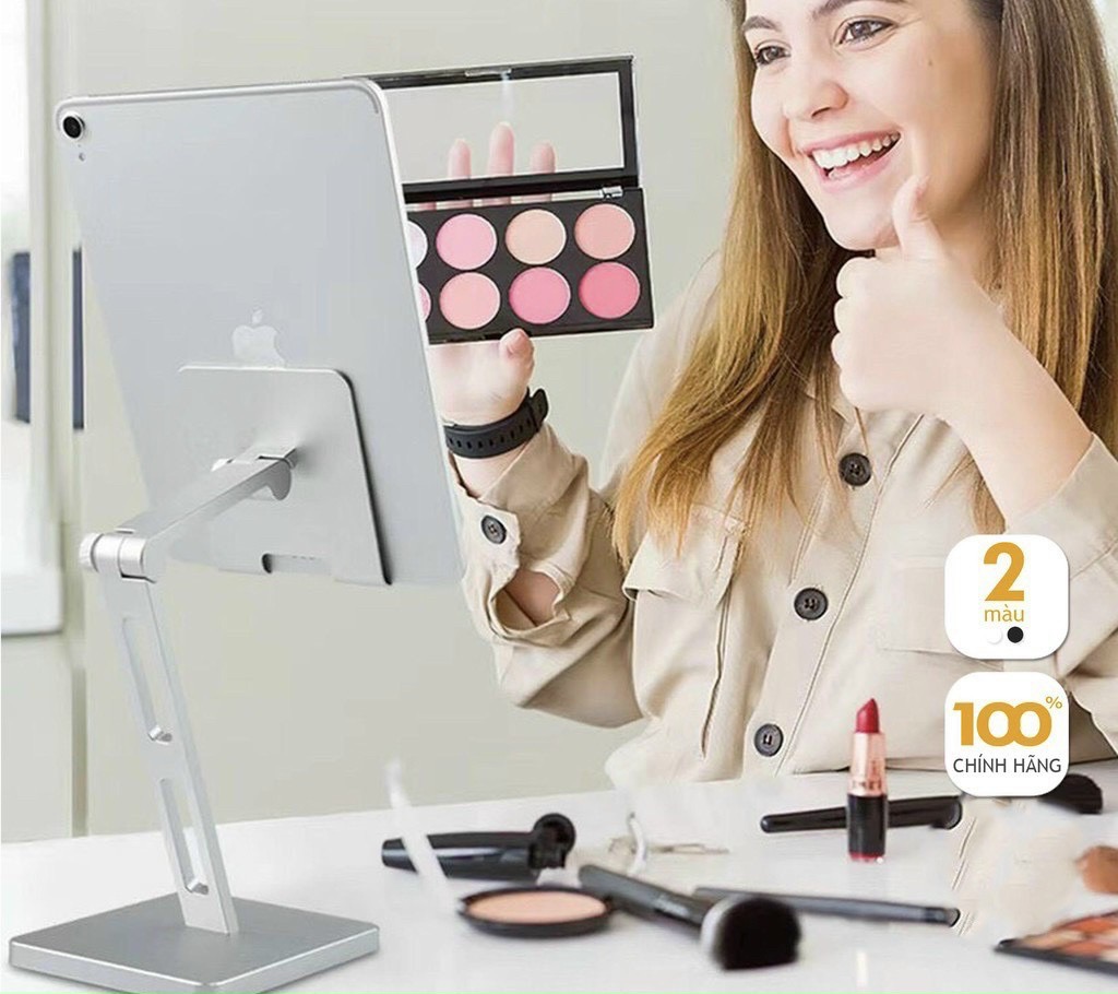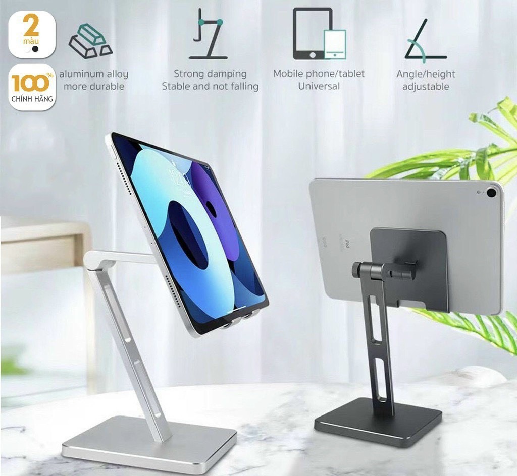 - Dáng kệ chắc chắn, phần trụ tiếp xúc với mặt bàn vuông to bản, giá dáng to rộng trục dài, phần giá đỡ được lót miếng đệm cao su tăng độ bám cho ipad và chống xước rất hiệu quả.