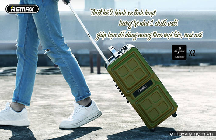Điểm nổi bật đầu tiên của chiếc loa Bluetooth RB-X5 chính là thiết kế kiểu dáng khá bắt mắt, dù trên thực tế chúng chỉ được trang bị 2 gam màu không quá nổi bật là xanh rêu và đen. Không ngoa khi nói rằng, nếu nhìn từ xa bạn sẽ thấy chúng chẳng khác gì một chiếc vali di động với các chi tiết thiết kế khá tinh tế.