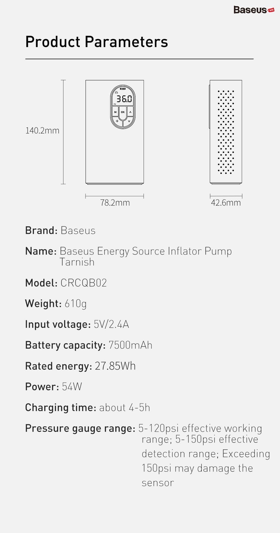 Pressure gauge range: 5-120psi effective working range, 5-150psi effective detection range, exceeding 150psi may damage the sensor