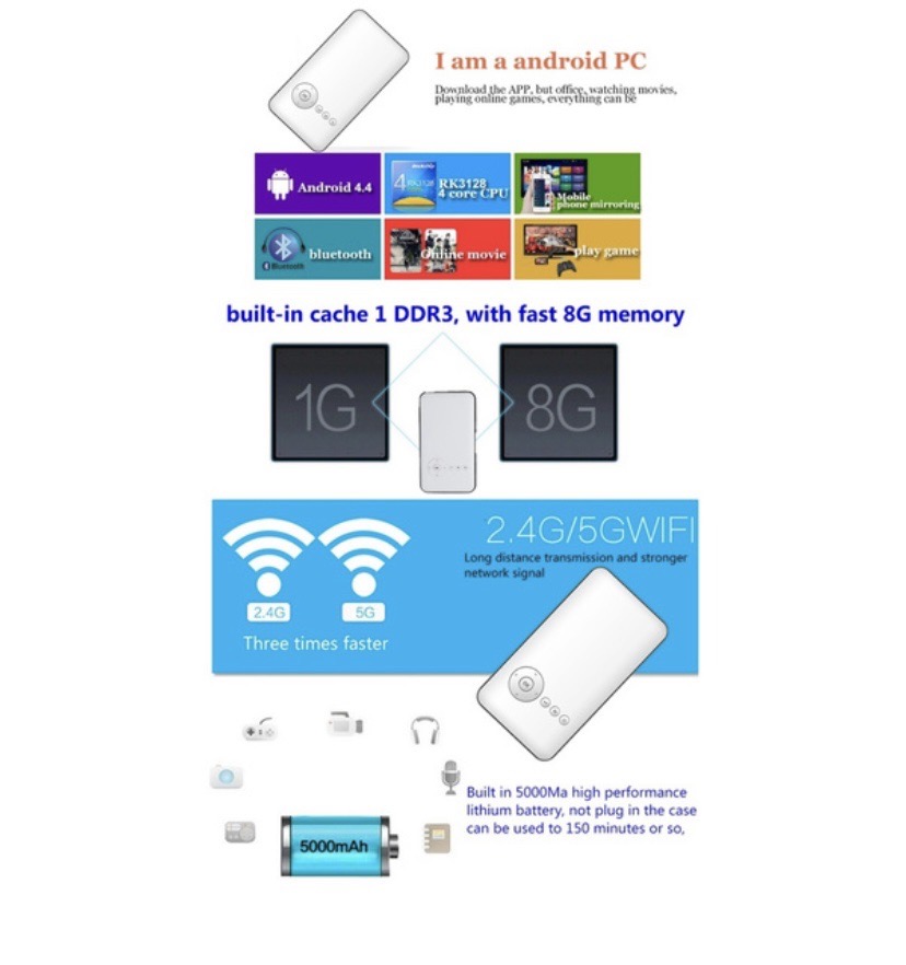 4. Tích hợp pin lithium hiệu suất cao 4200mAh cho khả năng trình chiếu từ 60 - 150 phút hoặc lâu hơn. Ngoài ra máy chiếu có thể làm pin dự phòng để sạc cho điện thoại, máy tính bảng của bạn một cách tiện lợi.