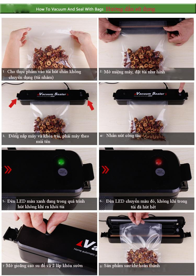 – Sản phẩm bao gồm: 1 máy hút chân không + 1 sách hướng dẫn + 10 túi hút chân không.