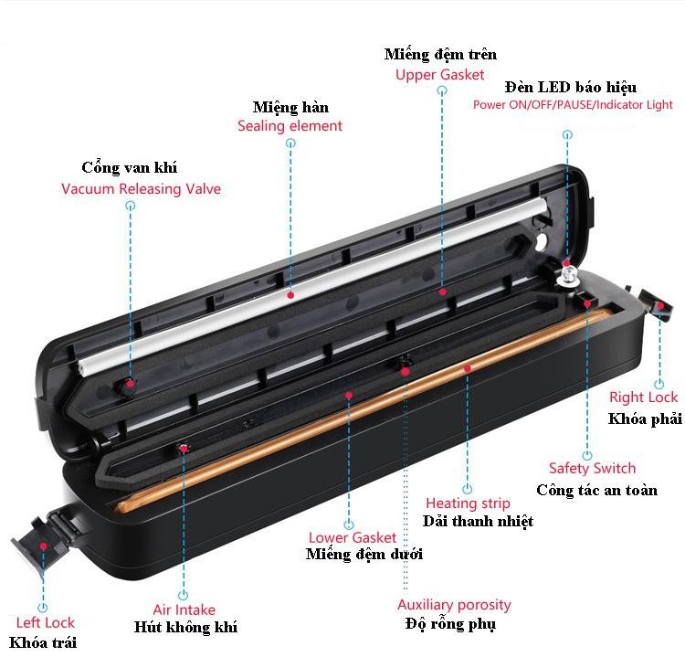 1: Không sờ vào bộ phận hàn túi của máy hút chân không khi đang cắm điện.