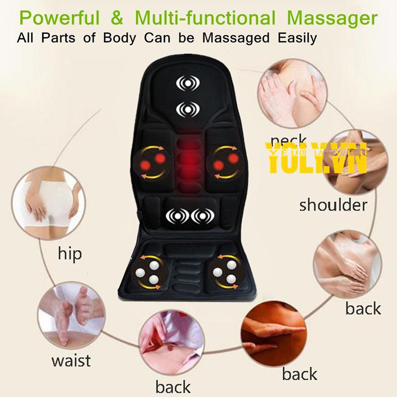 - Đệm massage toàn thân với 9 motor massage được trải đều toàn tấm nệm giúp người sử dụng có thể được massage toàn thân, đặc biệt là các vị trí hay bị đau nhức như vai, lưng, mông, đùi và chân…