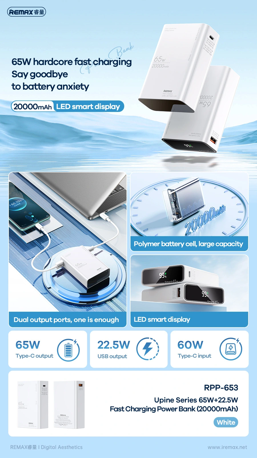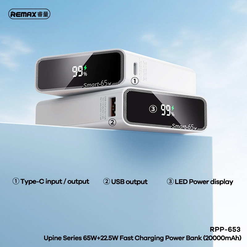 Pin sạc dự phòng Remax RPP-653 có rất nhiều ưu điểm và ưu điểm đầu tiên phải kể đến chính là dung lượng lớn 20.000mAh. Với nguồn dung lượng này, người dùng có thể sạc đầy cho các dòng điện thoại , máy tính bảng, và kể cả laptop.