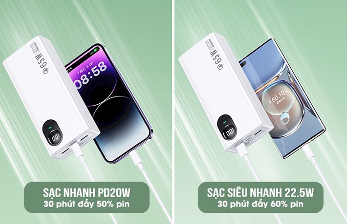 Remax RPP-503 hỗ trợ nhiều công nghệ sạc nhanh hiện đại. Cụ thể như, cổng Type C hỗ trợ đầu ra PD 20W kết hợp cáp 20W Remax RC-171cl giúp sạc nhanh iPhone 14 “đầy 50% pin trong 30 phút” nhanh hơn gấp 2.5 lần so với bộ sạc 5V / 2A thông thường. Cổng USB 2 hỗ trợ sạc siêu nhanh 22.5W, có thể sạc đầy cho Huawei Mate 40 “đầy 60% pin trong 30 phút” nhanh hơn gấp 2 lần so với bộ sạc 5V / 2A thông thường. Lưu ý, số liệu được trích xuất từ phòng thí nghiệm của Remax, nếu có sai lệch vui lòng tham khảo thực tế sử dụng.