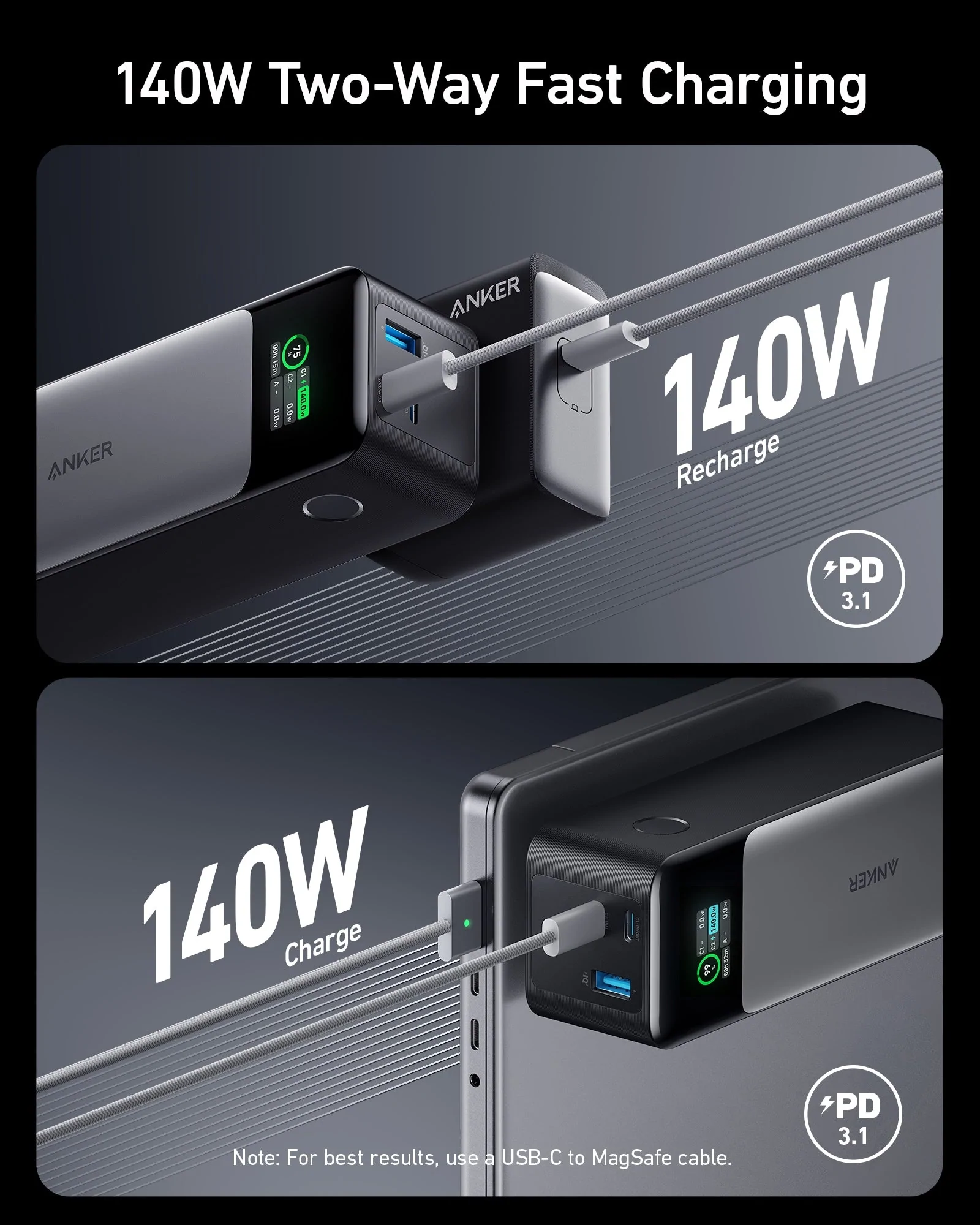 Được trang bị công nghệ Power Delivery 3.1 mới nhất ở cả 2 cổng input và output để nhanh chóng sạc lại pin dự phòng hoặc sạc cực mạnh ở công suất lên đến 140W.