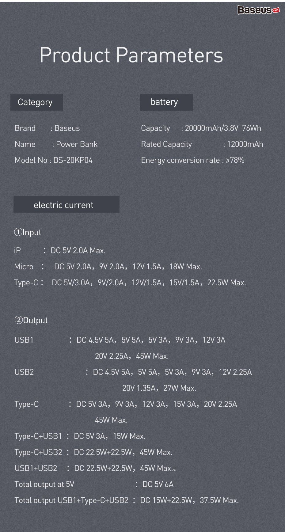 Tính năng cơ bản Pin dự phòng sạc nhanh, công suất cao Baseus Mulight Digital Display 45W ( 20,000mAh , PD/ Quick Charge Power Bank)